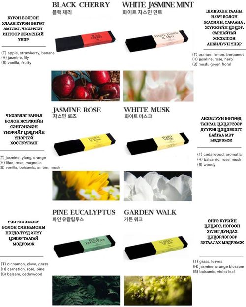 12 төрлийн анхилуун үнэрийг нэг дор агуулсан үнэрт хүж Фрэгнанс ойлоор баяжуулсан үнэр Бамбу модон суурьтай хүний биед сөрөг нөлөөгүй, цэвэр байгалийн гаралтай 25 см урттай нэг ширхэг хүж 60 минутын турш үл тасрах анхилуун уур амьсгалыг мэдрүүлнэ.