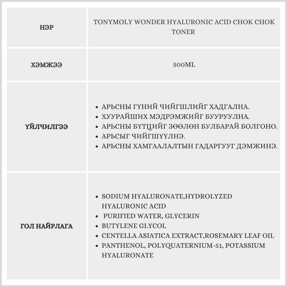 Энэхүү тонер нь арьсанд хуурайшсан мэдрэмж өгч таталдуулахгүй. Арьсыг зөөлөн булбарай болгож чийгшүүлнэ.