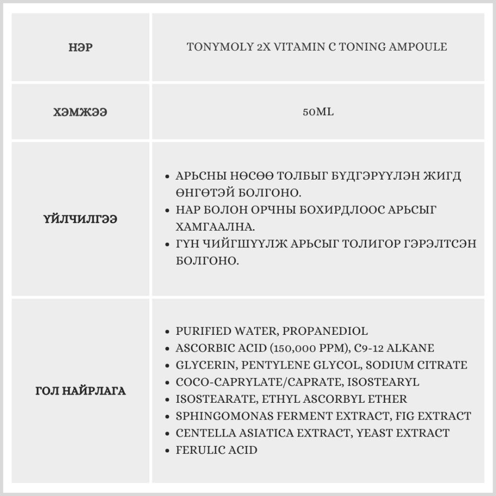 Энэхүү ампуль нь арьсыг гэрэлтсэн толигор болгож нөсөө толбыг бүдгэрүүлэн арьсыг жигд өнгөтэй болгоно. Арьсны уян хатан чанарыг сайжруулан чангална.