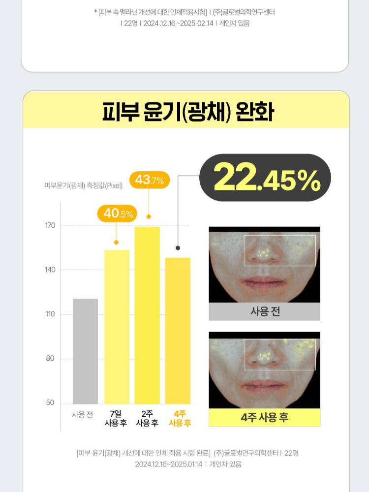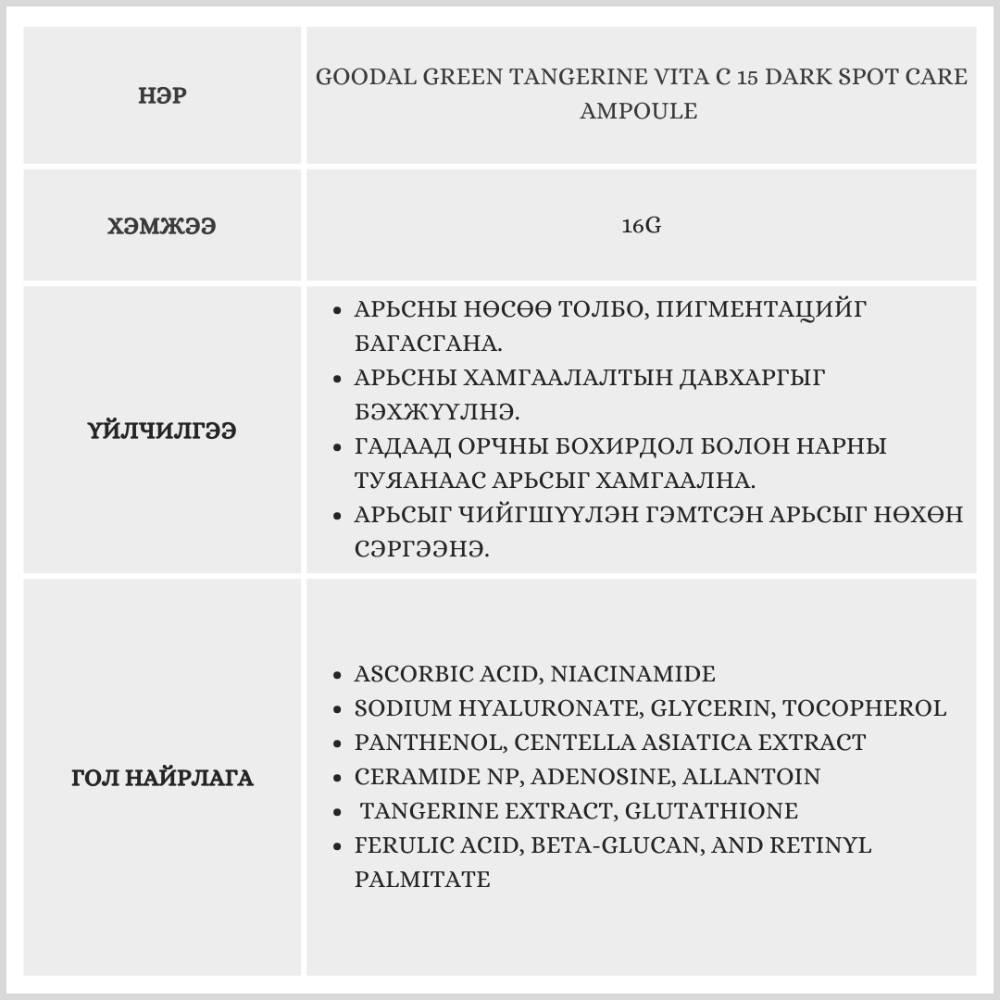 Энэхүү бүтээгдэхүүн нь Витамин С ийн агууламжтай бөгөөд энэ нь арьсыг гэрэлтсэн, чийглэг, жигд өнгөтэй болгоно. Арьсыг тайвшруулан гүн чийгшүүлж арьсыг толигор гэрэлтсэн болгоно.