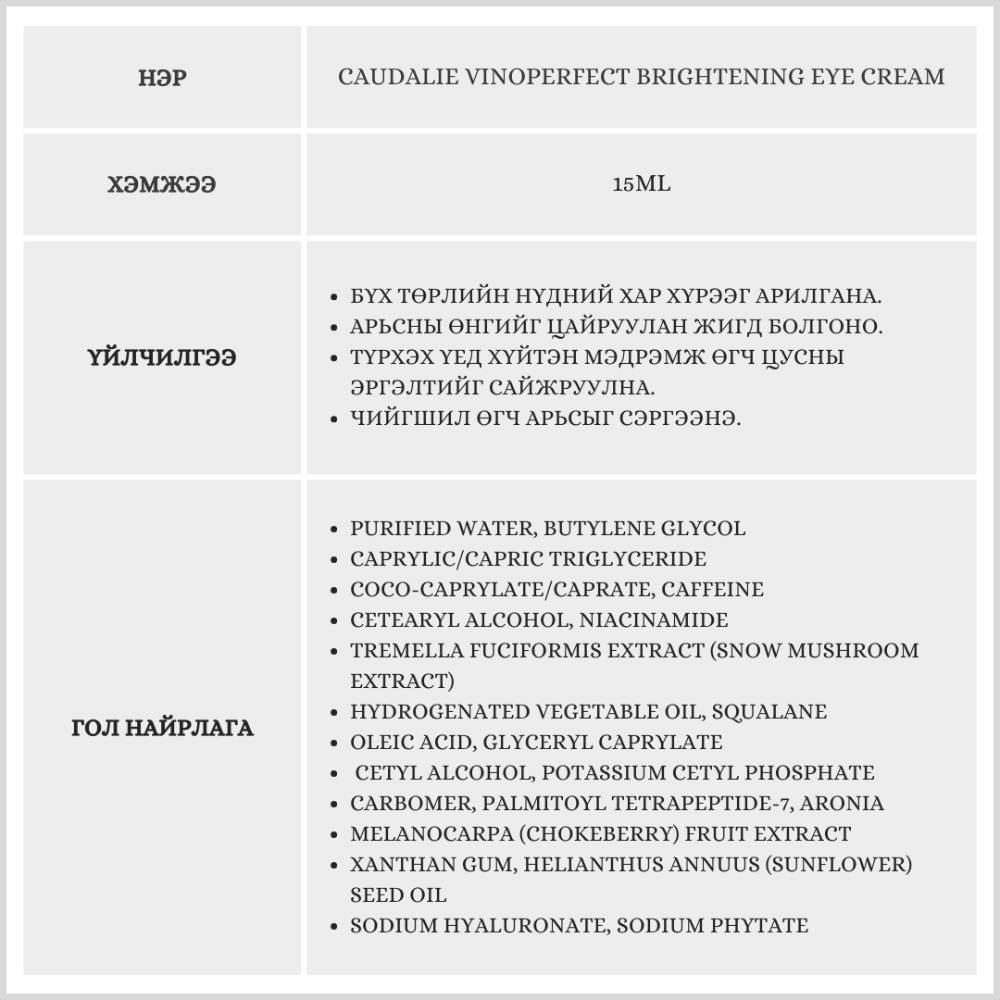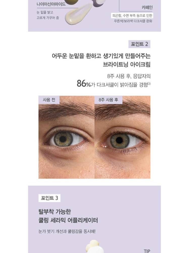 Энэ бүтээгдэхүүн нь нүдний доод хэсгийн хар хүрээг арилган арьсны өнгийг жигд болгоно. Цусны эргэлтийг сайжруулан чийгшүүлнэ.