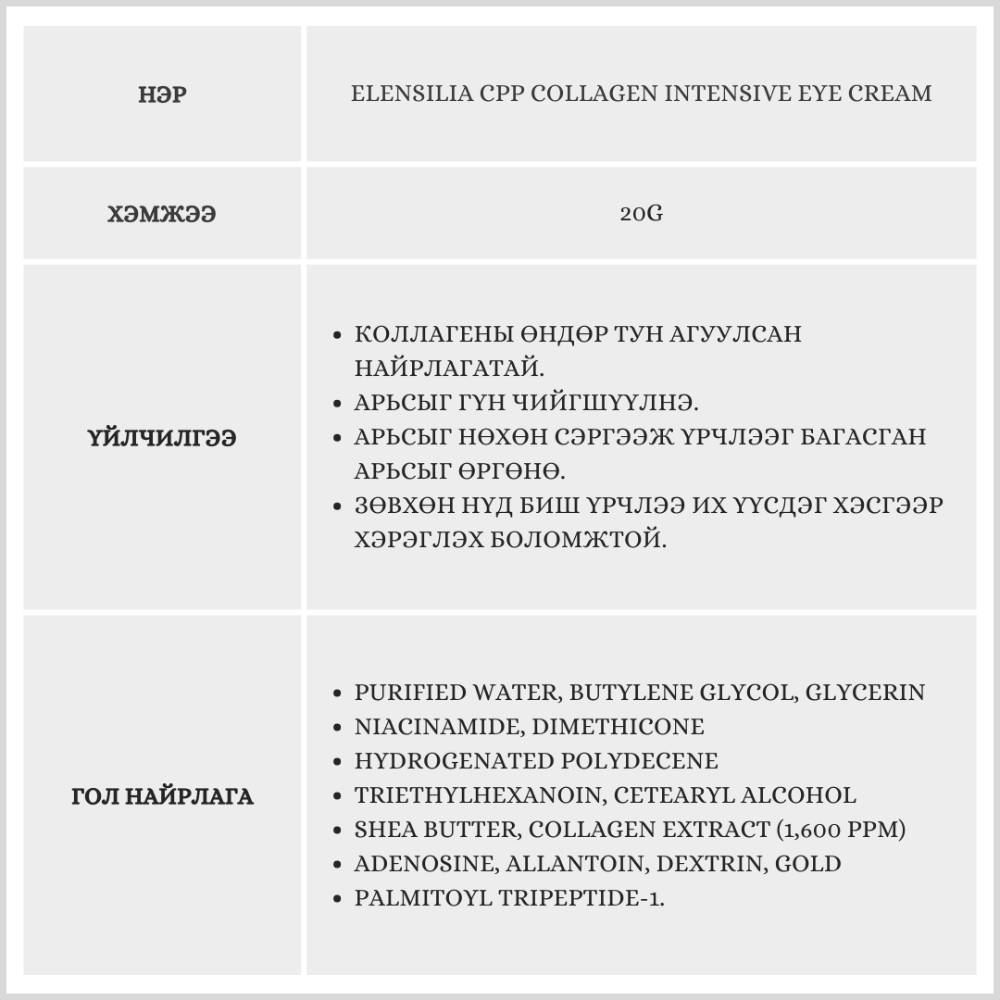 Коллагений найрлага өндөр бүтээгдэхүүн бөгөөд арьсыг чангалан уян хатан чанарыг нэмэгдүүлнэ. Арьсыг нөхөн сэргээж үрчлээг багасгана.