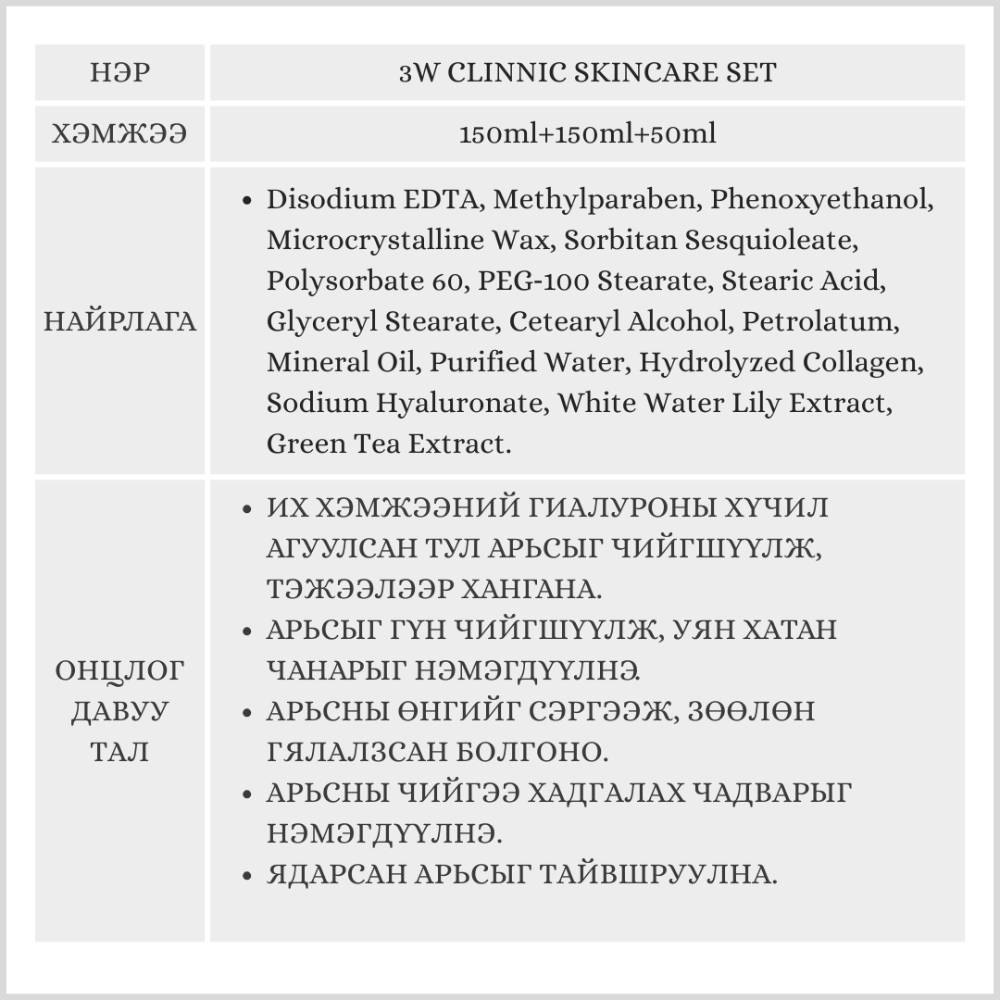 3W Clinnic Skincare Set/Арьс арчилгааны сет/