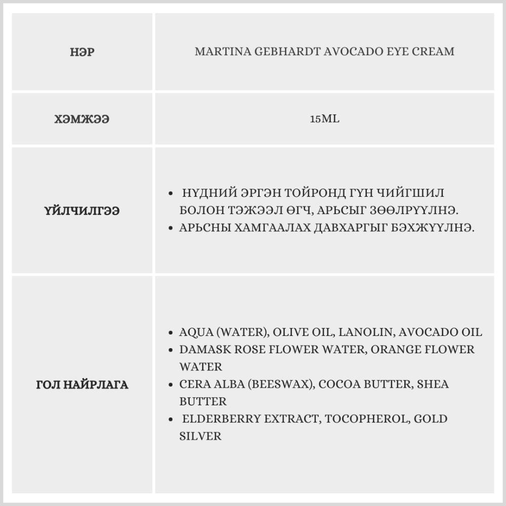 Уг бүтээгдэхүүн нь бүх төрлийн арьсанд тохиромжтой ба авакадо тосны найрлагатай учир гүн чийгшүүлэн тэжээл өгнө.
