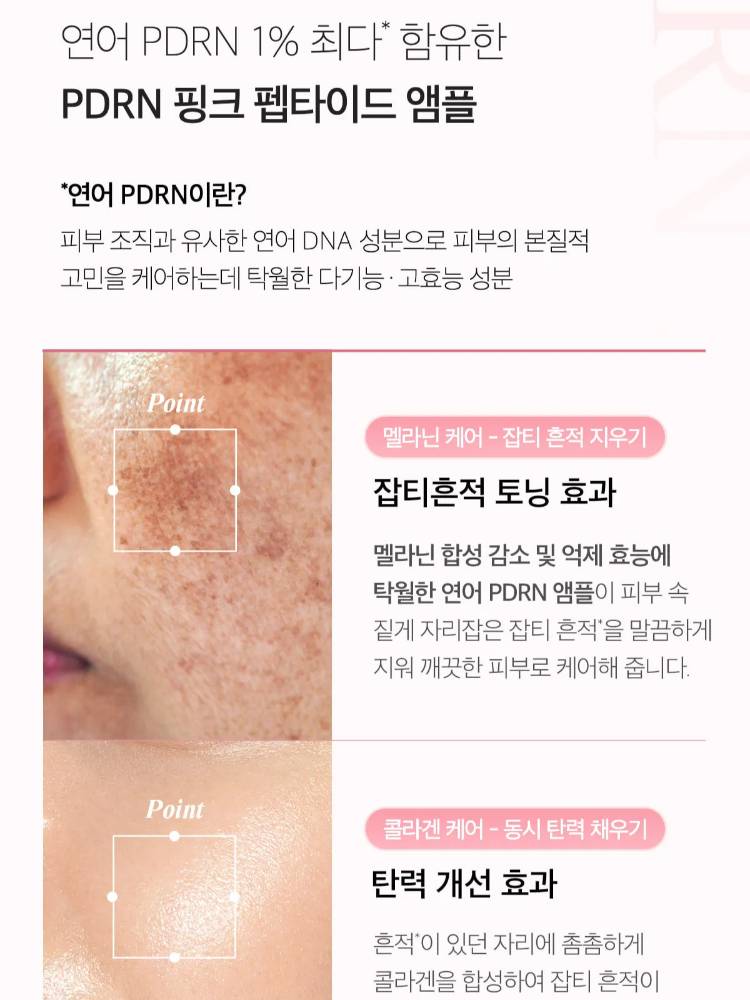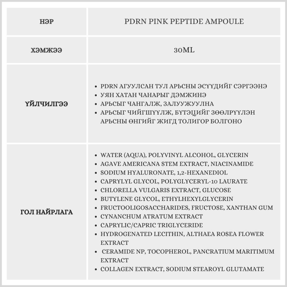PDRN найрлагаараа арьсны эсийг сэргээн, уян хатан чанарыг дэмжиж залуужуулна. Пептид болон ниацинамидын хослол нь арьсны өнгийг жигд болгож, толигор гялалзсан төрхийг бий болгоно. Хурдан шингэдэг бүтэцтэй тул аль ч үед давхарлан хэрэглэх боломжтой.