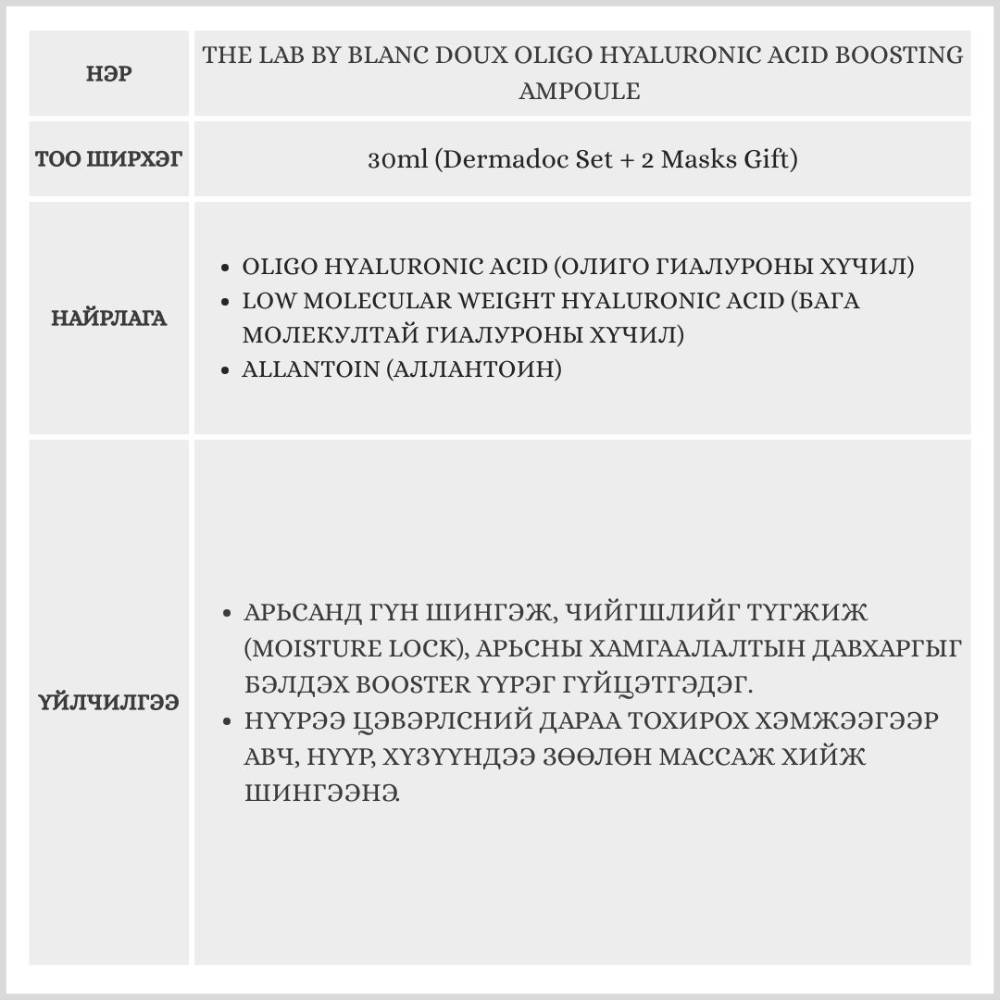Жижиг молекулт Oligo гиалоруны хүчил агуулсан, арьсыг гүн чийгшүүлж хуурайшилтыг багасгах үйлчилгээтэй Boosting ампуль. Нүүрний чийгшүүлэгч маск бэлгэнд дагалдана.