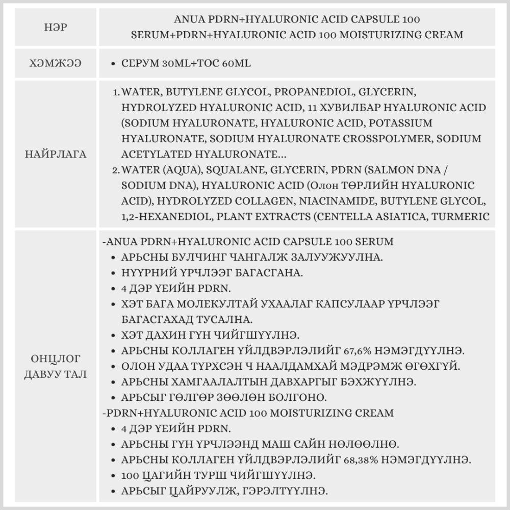 PDRN тэй ба жижиг молекулт ухаалаг капсулаар арьсны давхаргыг дүүргэн үрчлээг багасгахад тусална.