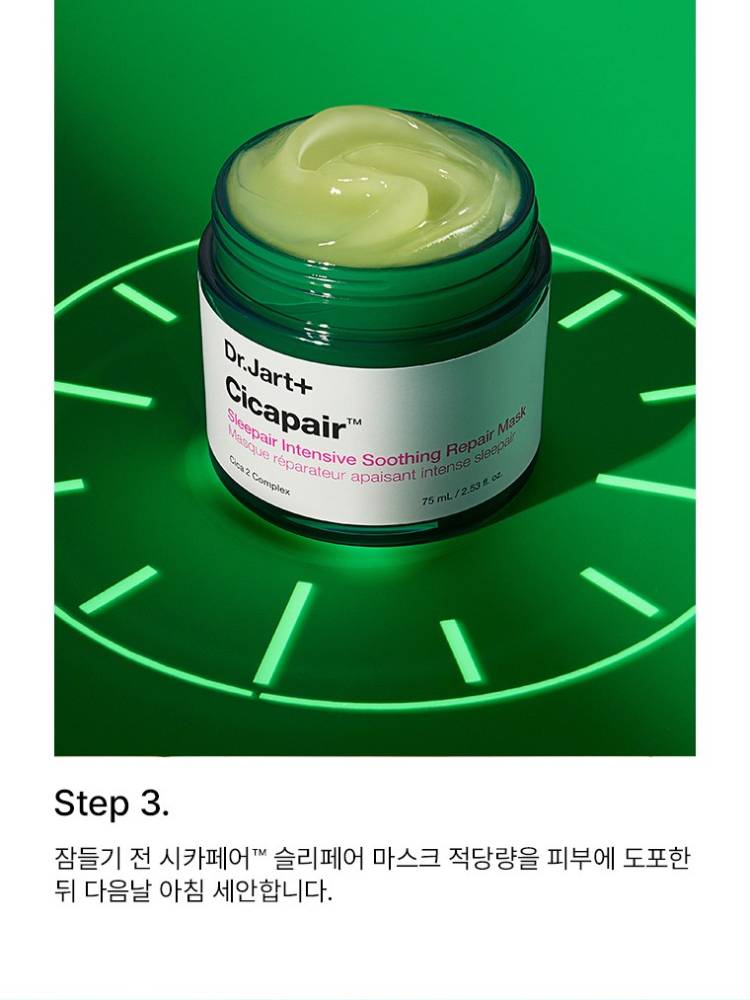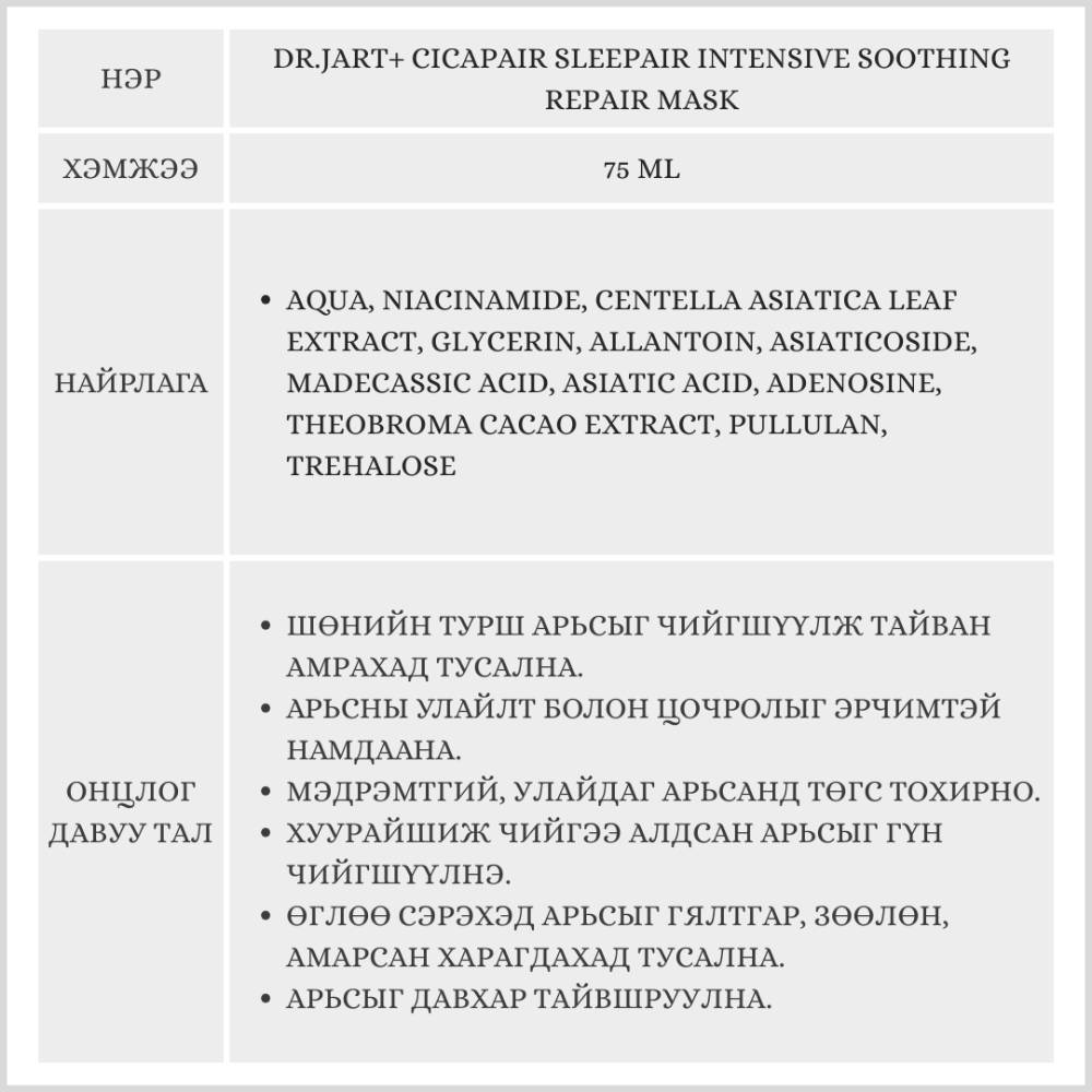 Dr.Jart+Dr.Jart+ Cicapair Sleepair Intensive Soothing Repair Mask нь унтахын өмнө хэрэглэх шөнийн маск бөгөөд мэдрэмтгий, цочирсон арьсыг тайвшруулж, нөхөн сэргээх үйлчилгээтэй. Цика агуулсан тул арьсны хамгаалалтын давхаргыг бэхжүүлж арьсны эмзэгшил, улайлтыг багасгана.