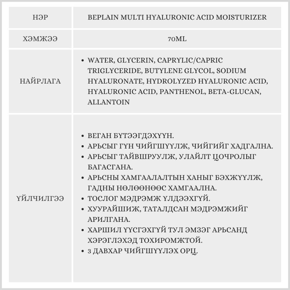 Энэхүү бүтээгдэхүүн нь гуравласан чийгшүүлэх найрлагатай. Арьсыг тайвшруулан улайлт, цочролыг багасган тайвшруулна.