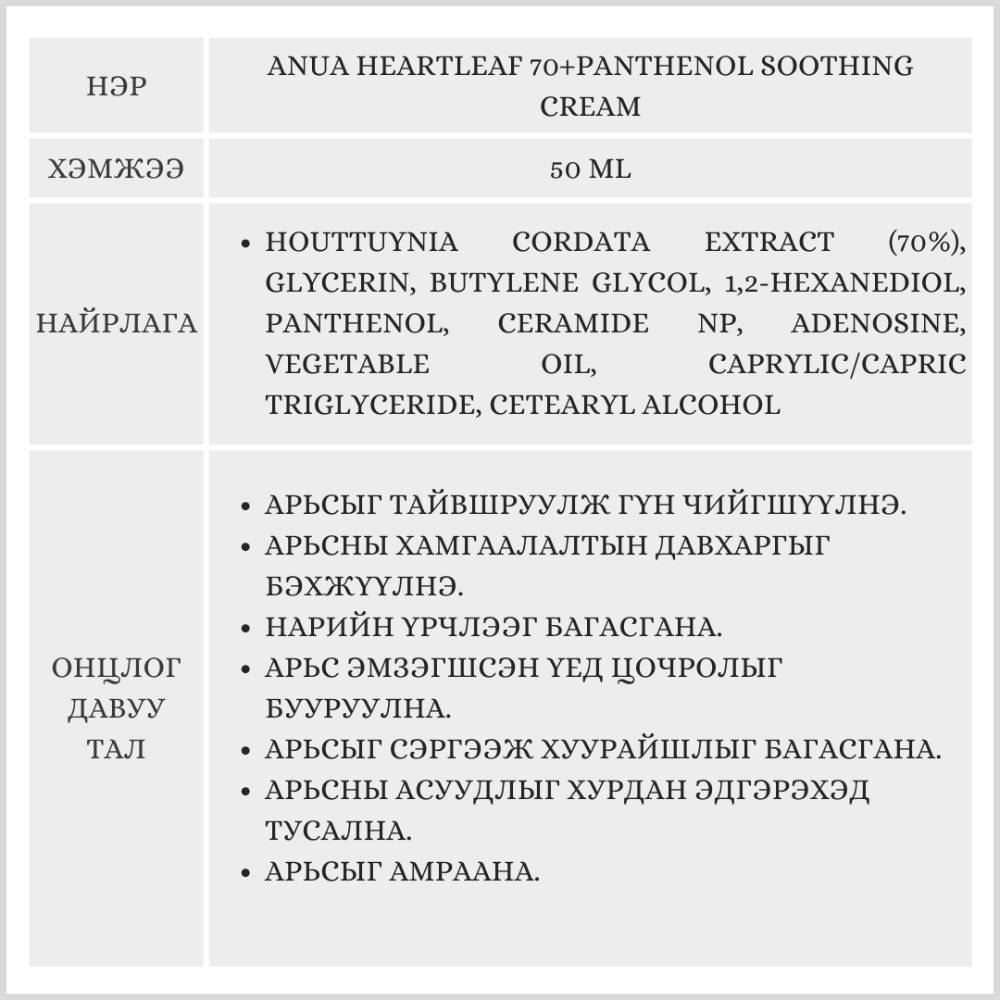 Anua Heartleaf 70 Panthenol Soothing Cream, 50ml / Нүүрний тос/