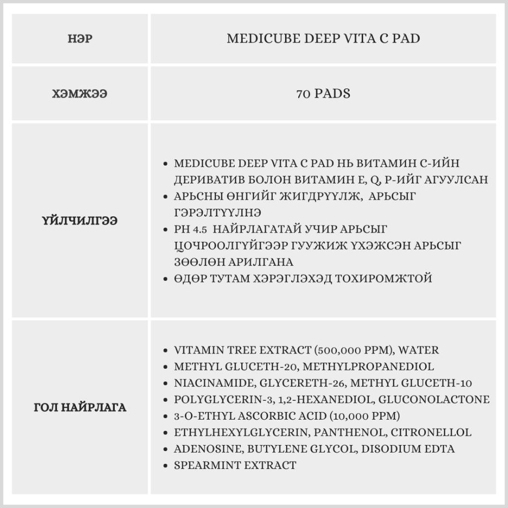 Энэхүү Medicube Deep Vita C Pad нь витамин C, E, Q, P агуулсан тул арьсны өнгийг жигдрүүлж, арьсыг гэрэлтүүлнэ.Арьсыг гүн чийгшүүлж, уян хатан байдлыг нэмэгдүүлнэ.