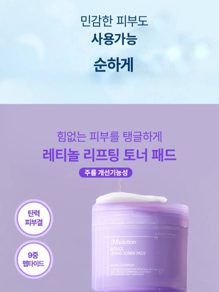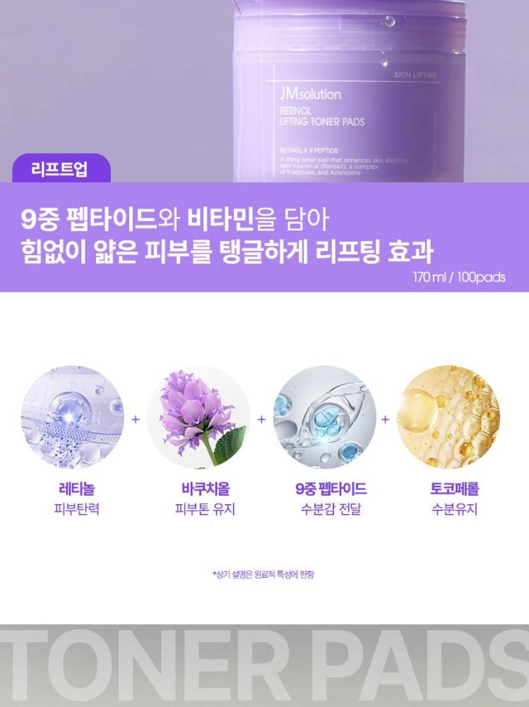 JM Solution Ретинол лифтинг тонер пад нь ретинол болон 9 төрлийн пептид агуулсан тул арьсны уян хатан чанарыг сайжруулж, суларсан арьсыг чангална.Үрчлээг багасгаж, арьсны бүтцийг жигд болгож арьсыг илүү эрүүл, толигор харагдуулна.