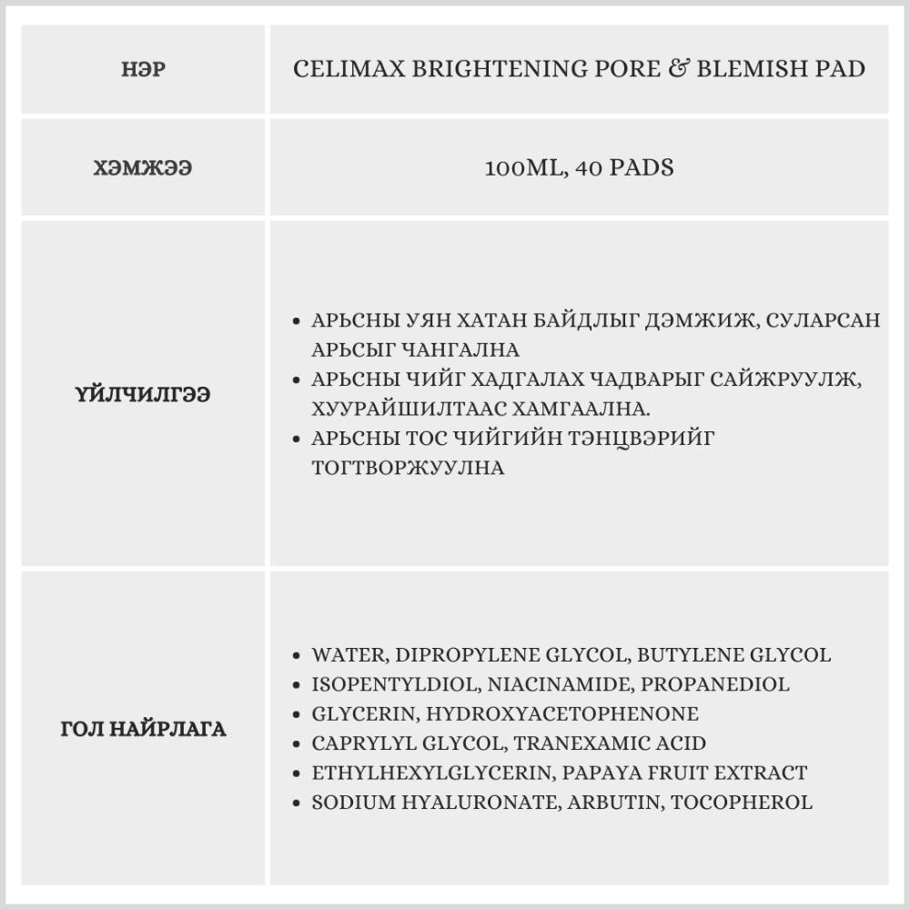 Энэхүү бүтээгдэхүүн нь арьсыг гүн чийгшүүлж, өнгийг жигдрүүлэн эрүүл гэрэлтсэн болгоно. Үхэжсэн арьсыг зөөлөн гуужуулж, арьсны бүтцийг сайжруулна.