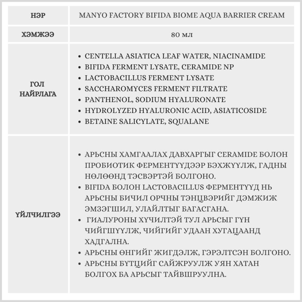 Хуурай арьсанд зориулсан арьсыг супер чийгшүүлэх үйлчилгээтэй нүүрний тос. Арьсны хамгаалалтын давхаргыг бэхжүүлэх ба арьсны бүтцийг сайжруулж уян хатан болгоно.