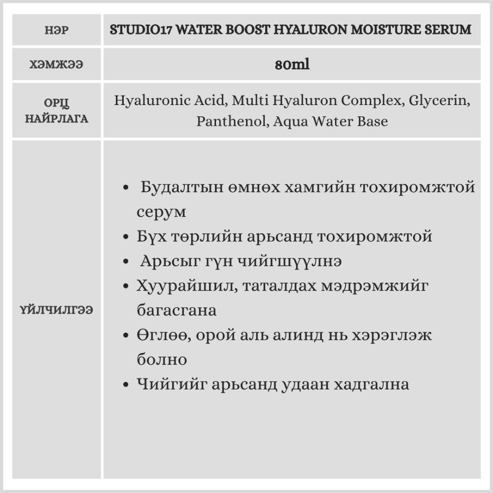 “Хамгийн төгс будалтын суурь Studio17 Water Boost!” Хөнгөн текстуртай тул арьсыг тайвшруулж гүн чийгшүүлнэ. 80ml савалгаатай тул удаан хэрэглэнэ. Бүх төрлийн арьсанд тохиромжтой.