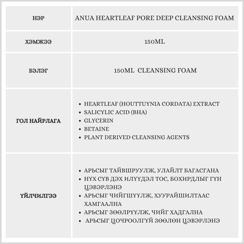 Хөөсөн бүтэц сайтай тул илүүдэл тос, бохирдол, арьсны нүх сүв дэх тослогийг гүн цэвэрлэнэ.Арьсыг тайвшруулж, улайлт цочролыг багасгана.Арьсыг таталдуулахгүй, цэвэрлэсний дараа чийгшлийг хадгалж, тослог болон эмзэг арьсанд өдөр тутам хэрэглэхэд тохиромжтой.