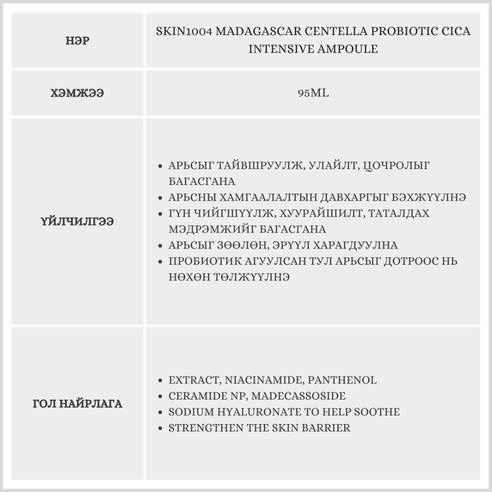 Энэхүү бүтээгдэхүүн нь хөгшрөлтийн эсрэг үйлчилгээ үзүүлж, хялгасан үрчлээг багасгана. Арьсыг тайвшруулж, улайлтыг багасгана. Ашигтай бактери агуулсан тул арьсыг нөхөн төлжүүлнэ.