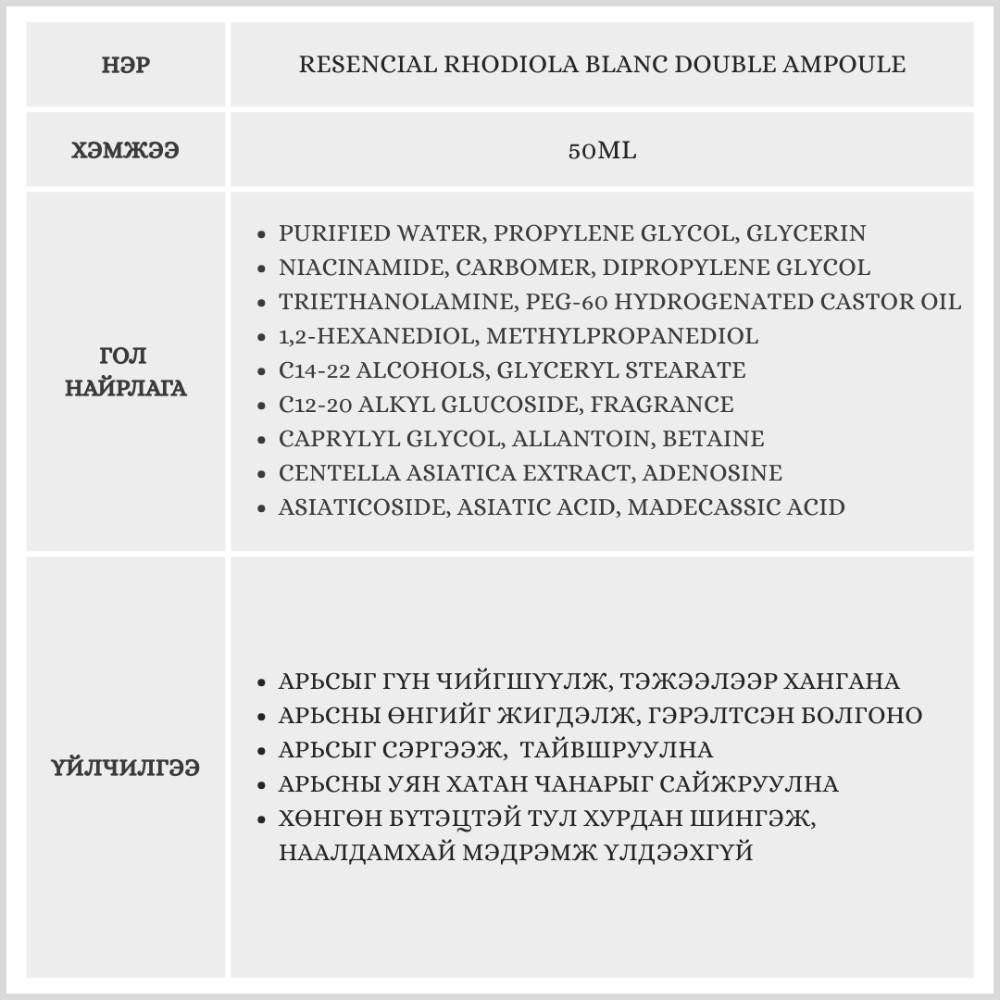 Энэхүү ампул нь арьсыг гүн чийгшүүлж, тэжээлээр ханган арьсыг тайвшруулна. Арьсны өнгийг жигдлэж, гэрэлтсэн болгоно.