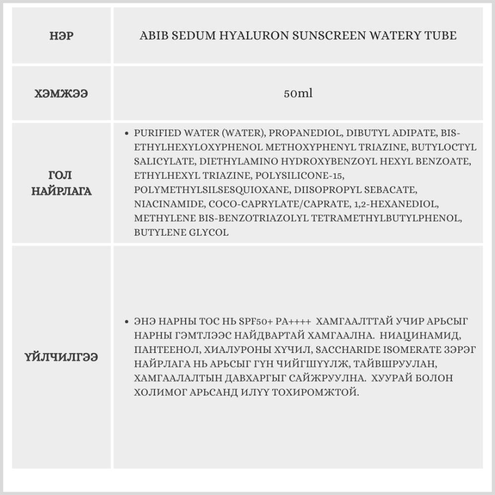 Abib брэндийн нарны тос нь SPF50+ PA++++ өндөр хамгаалалттай давхар чийгшил, арьсны тав тухыг шийдэж өгсөн усан суурьтай, хөнгөхөн бүтэцтэй нарны тос юм. Серум шиг хөнгөхөн, усан мэт бүтэцтэй тул арьсанд наалдахгүй, тослог үүсгэхгүй, нүүр будалтын өмнө хэрэглэхэд тааламжтай.