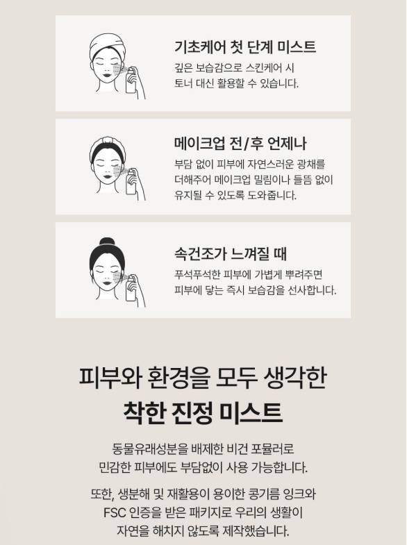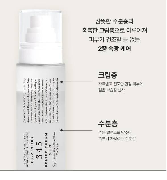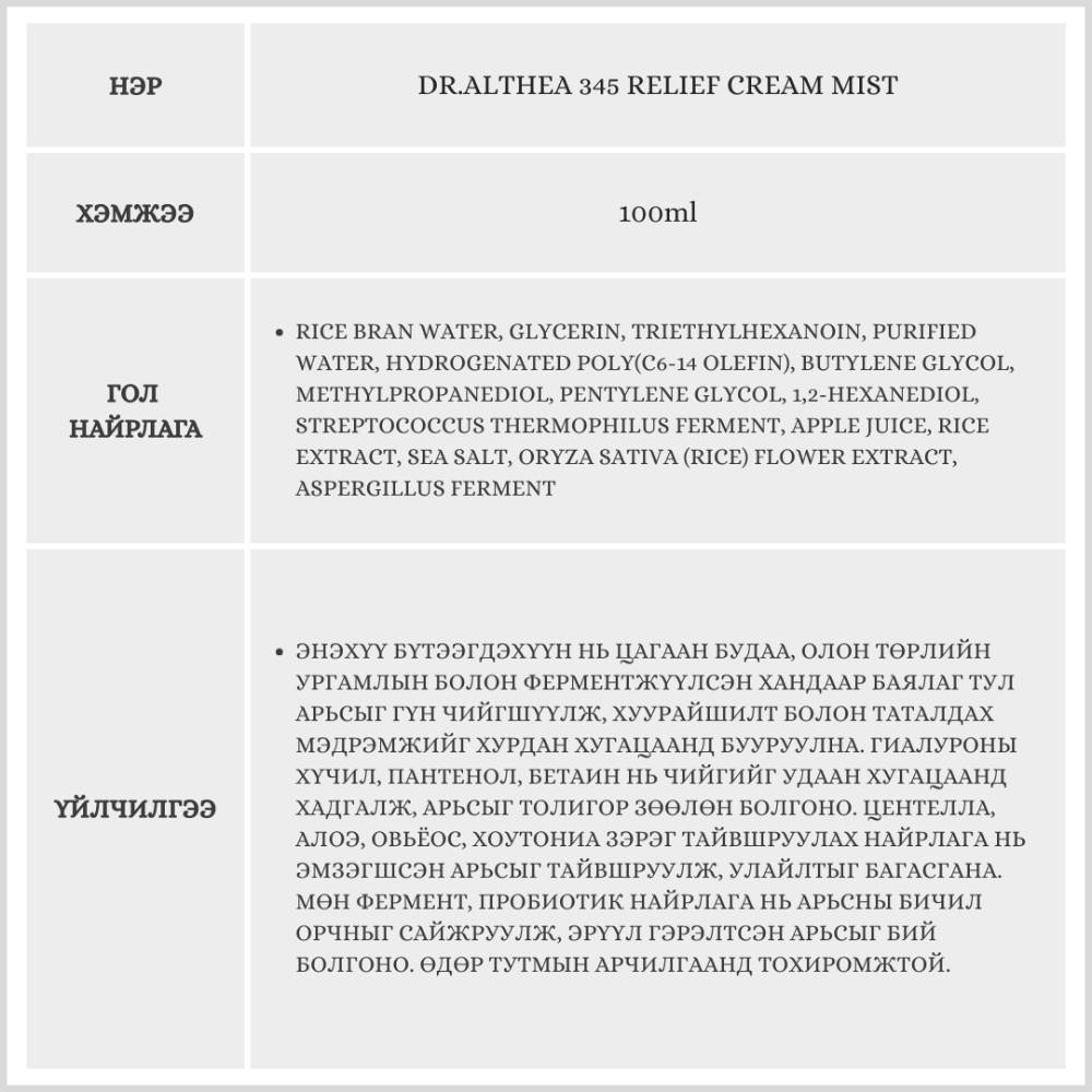 Энэхүү мист нь эмзэг цочирдсон арьсыг тайвшруулж, чийг тэжээлээр хангах үйлчилгээтэй. Арьсны хамгаалах давхаргыг сайжруулж, улайлт, халуу оргих мэдрэмжийг бууруулна. Тогтмол хэрэглэснээр арьс илүү тайван, зөөлөн, тэнцвэртэй болно.