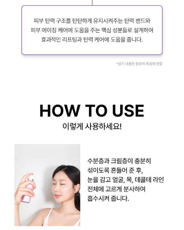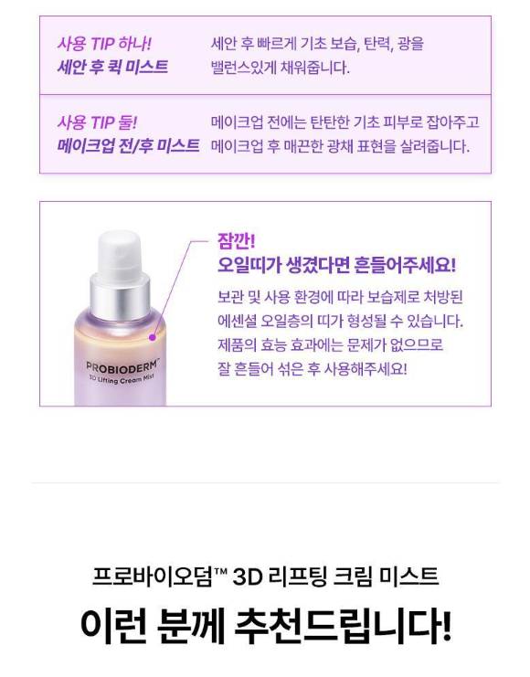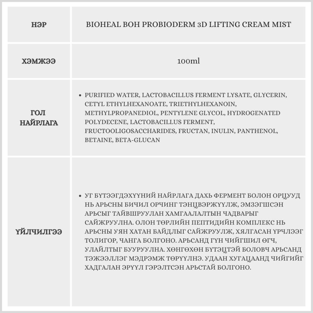 Энэ мист нь пробиотик ферментийн комплексийг агуулсан ба арьсны хамгаалах давхаргыг сайжруулан арьсанд гүн чийгшил өгөх, тэжээл өгөх үйлчилгээтэй lifgting бүтээгдэхүүн юм. Нүүр будалтын өмнө болон дараа аль ч үед ашиглах боломжтой.