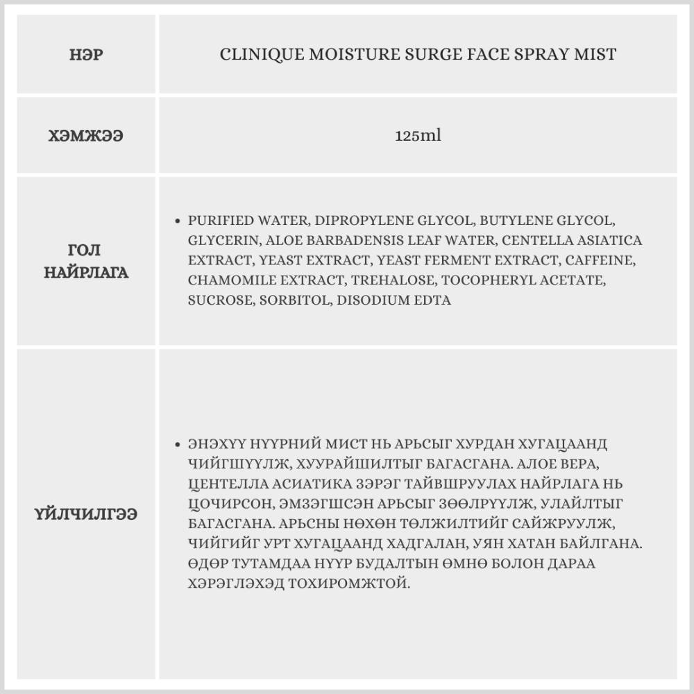 Энэ бүтээгдэхүүн нь арьсыг богино хугацаанд гүн чийгшүүлж, зөөлрүүлэн тайвшруулах үйлчилгээтэй. Бүх төрлийн арьсанд тохиромжтой ба нүүр будалтын өмнө болон дараа хэрэглэж болно.