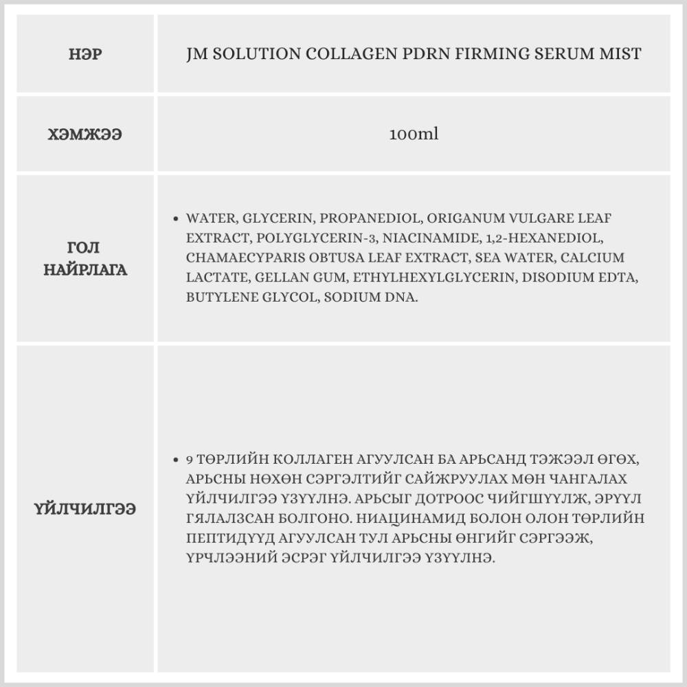 JMSolution брэндийн коллаген PDRN мист нь арьсыг нөхөн сэргээж, уян хатан чанарыг нэмэгдүүлэн чангалах үйлчилгээтэй бүтээгдэхүүн юм. Өдөр тутмын арьс арчилгаанд тогтмол хэрэглэвэл тохиромжтой.