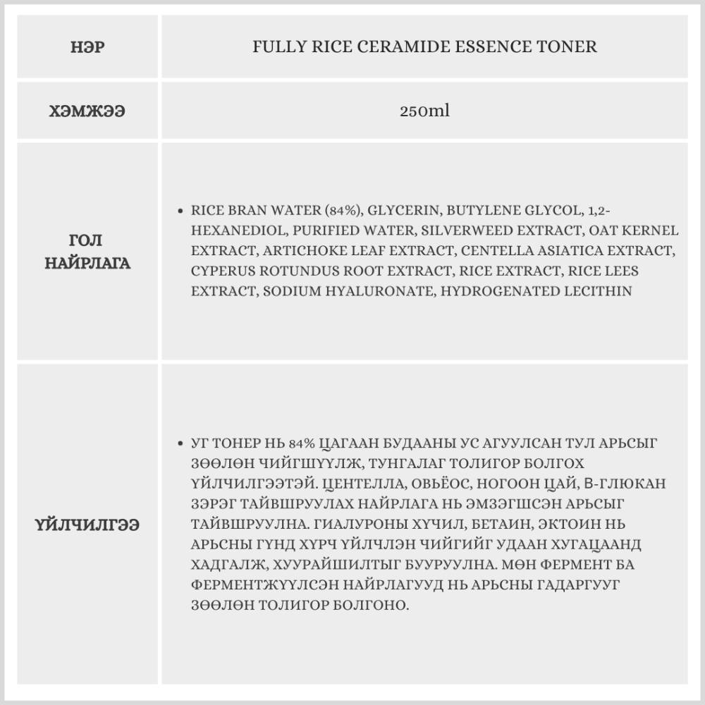 Энэхүү тонер нь цагаан будааны ханд агуулсан ба эссенц мэт зөөлөн бүтэцтэй тул арьсанд хурдан шингэж, арьсыг гүнээс нь чийгшүүлэх үйлчилгээтэй. Хуурай, чийг дутагдсан арьсанд тохиромжтой.