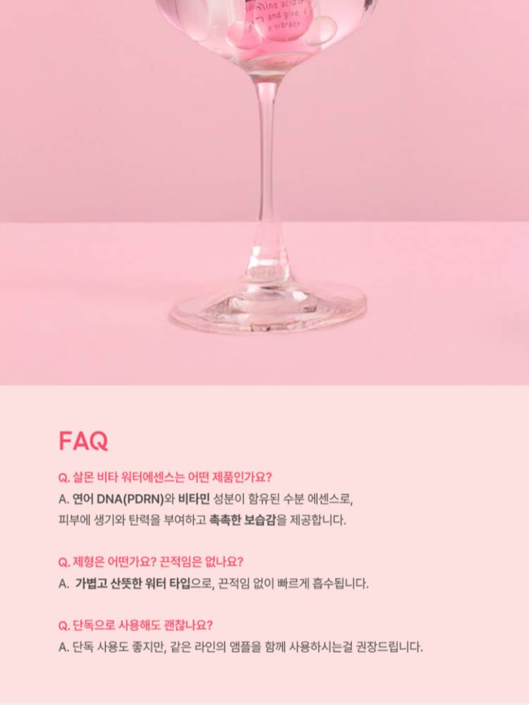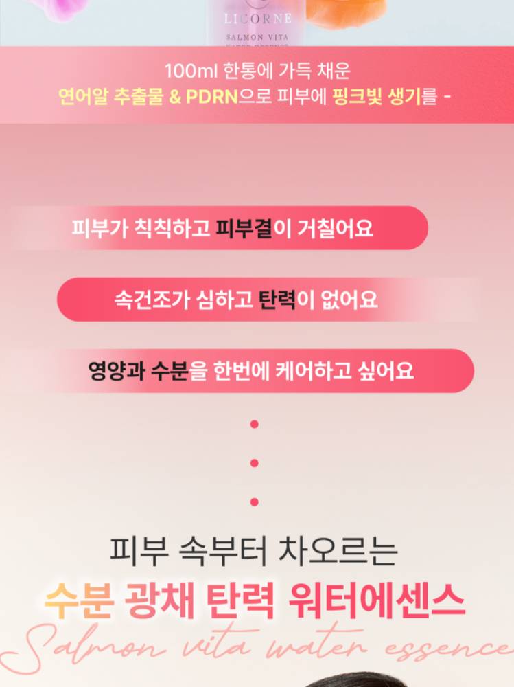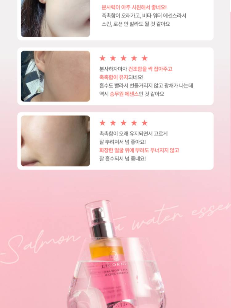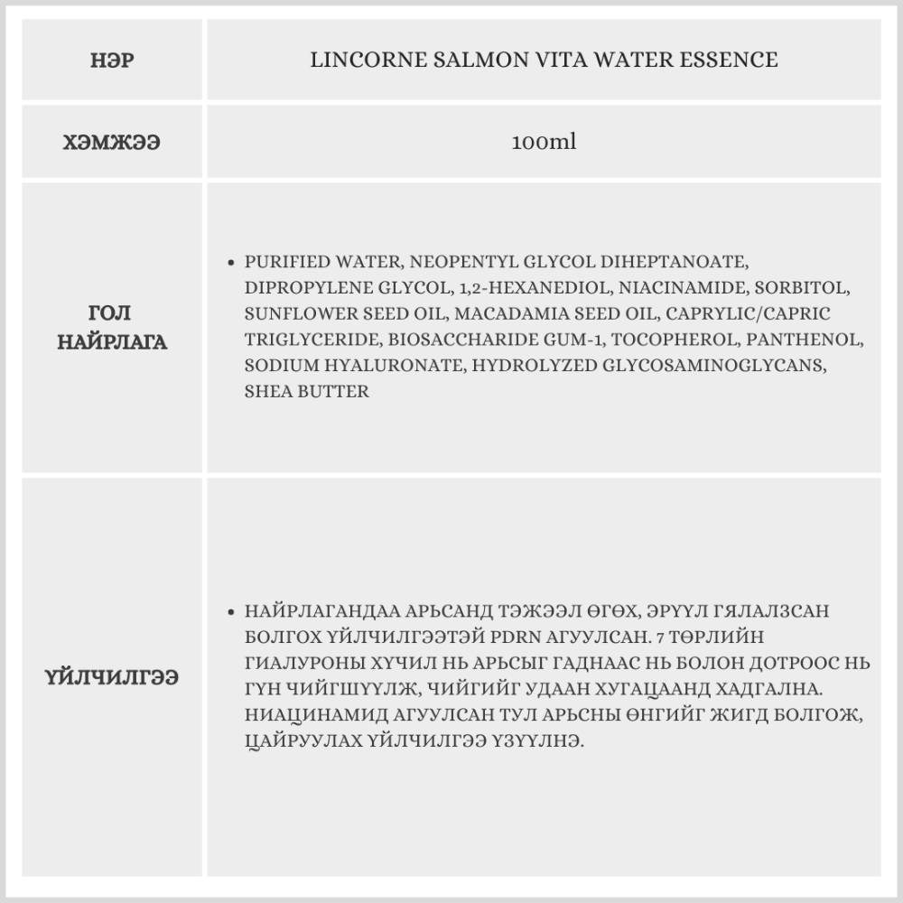 Энэхүү эссэнц нь салмоны тэжээллэг найрлагатай арьсны уян хатан чанарыг сайжруулж, арьсанд дээд зэргийн тэжээл өгөх үйлчилгээтэй. Хөнгөн усан бүтэцтэй тул арьсанд хурдан шингэж, чийглэг мэдрэмж төрүүлнэ.