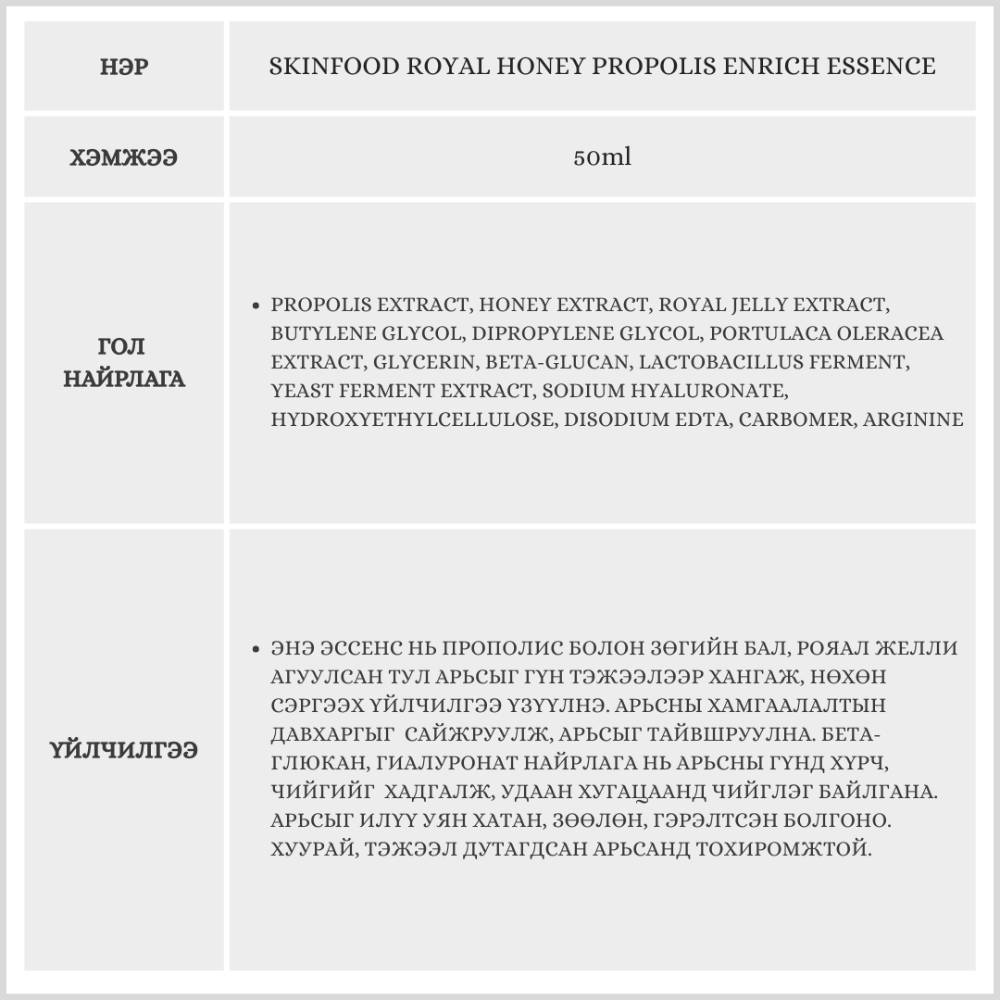 Энэхүү эссэнц нь арьсыг гүн тэжээлээр хангаж, суларсан арьсыг чангалж, нөхөн сэргээх үйлчилгээтэй. Хуурай, тэжээл дутагдсан арьсанд илүү тохиромжтой.