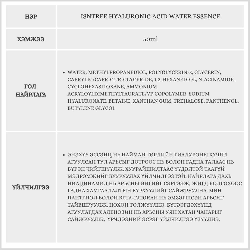 Энэхүү эссэнц нь арьсыг гүн чийгшүүлэх, арьсны гүнд чийгийг удаан хадгалах үйлчилгээтэй, хөнгөн бүтэцтэй бүтээгдэхүүн юм. Бүх төрлийн арьсанд тохиромжтой ба арьсыг зөөлөн, булбарай болгоно.