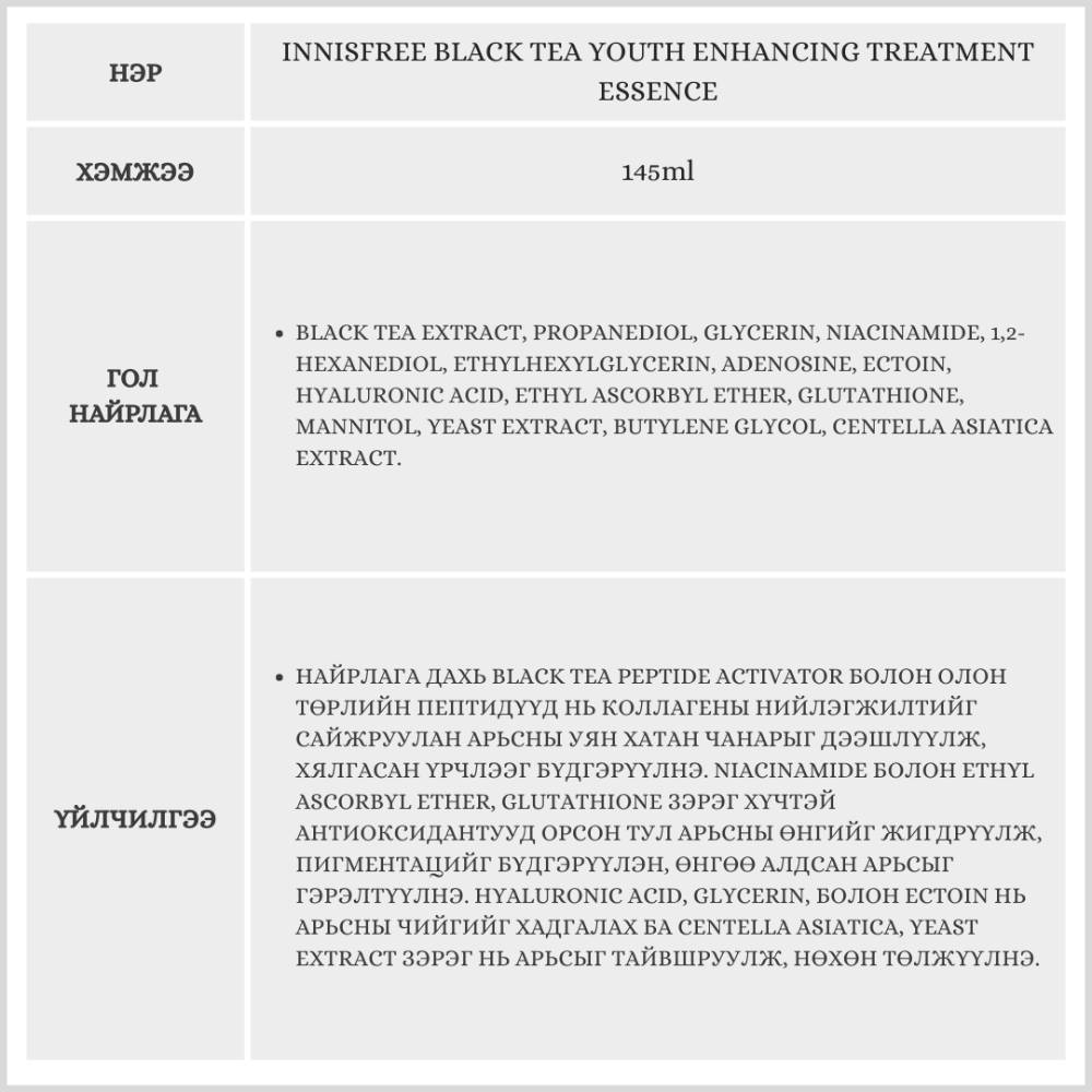 Innisfree брэндийн хар цайны антиоксидант найрлага бүхий энэхүү эссэнц нь арьсыг чийгшүүлж, арьсны өнгийг сэргээн, жигд болгохоос гадна арьсыг илүү гэрэлтсэн, эрүүл толигор харагдуулна.