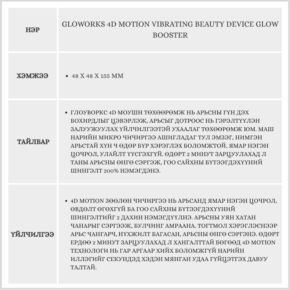 Өглөө, оройд ердөө 2 минут хэрэглэхэд арьсны өнгө сэргэж, гоо сайхны бүтээгдэхүүний шингэлт нэмэгдэнэ.