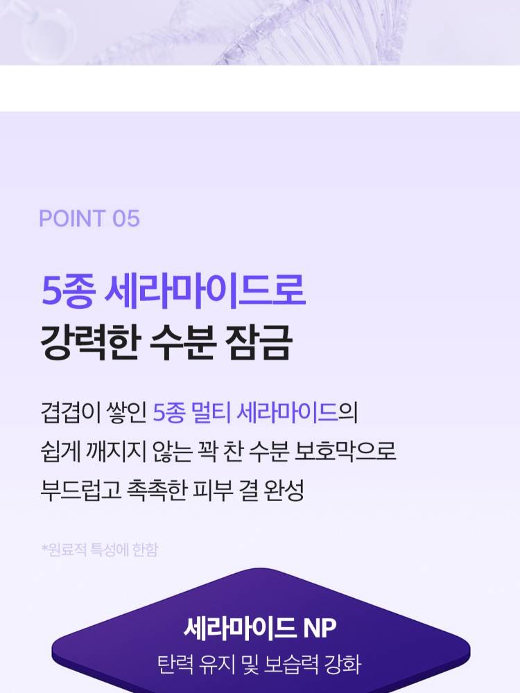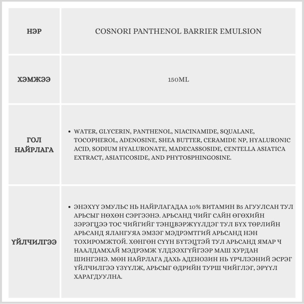 Найрлагадаа 10% пантенол агуулсан тул эмзэгшсэн арьсыг тайвшруулж, тос чийгний тэнцвэрийг барих ба солонгосын гоо сайхны нөлөөлөгчдийн дунд "Chaltteok" буюу маш сайн суурь лосьон гэдгээрээ алдаршсан бүтээгдэхүүн юм.