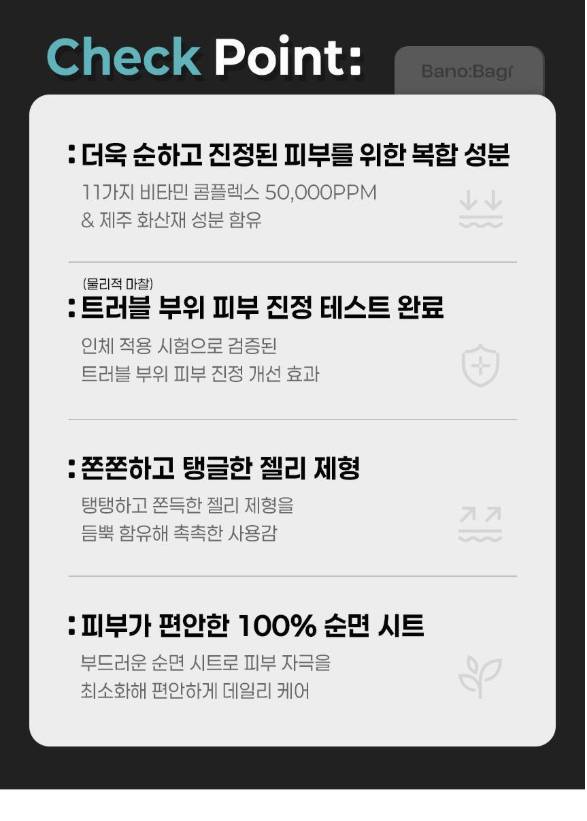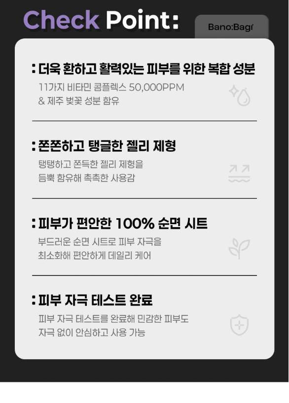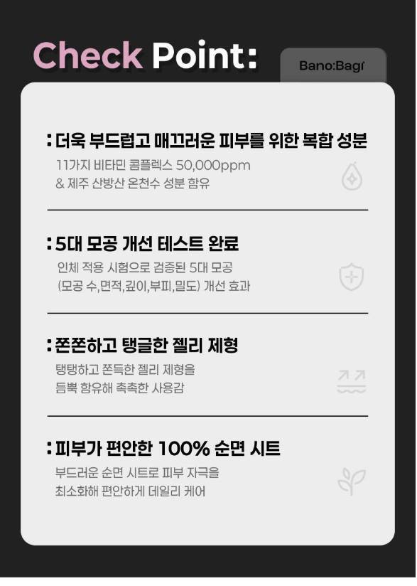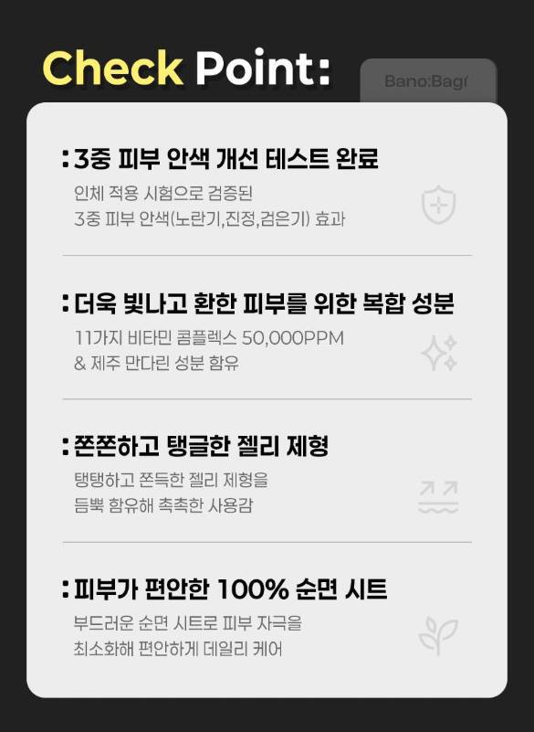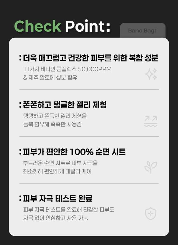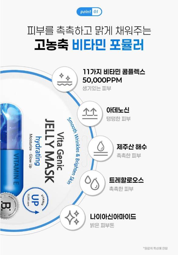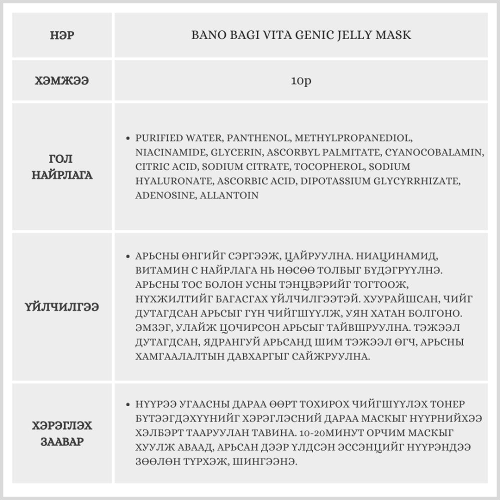 Энэхүү бүтээгдэхүүн нь арьсныхаа онцлогт тохируулан хэрэглэх боломжтой, витамины орц найрлагатай, 7 төрлийн үйлчилгээтэй нүүрний салфеткан маск юм. Желли бүтэцтэй тул арьсанд ашигтай орц найрлагууд нь арьсны гүнд хүрч, арьсыг гүн чийгшүүлэх, арьсны өнгийг сэргээх, тайвшруулах үйлчилгээтэй.