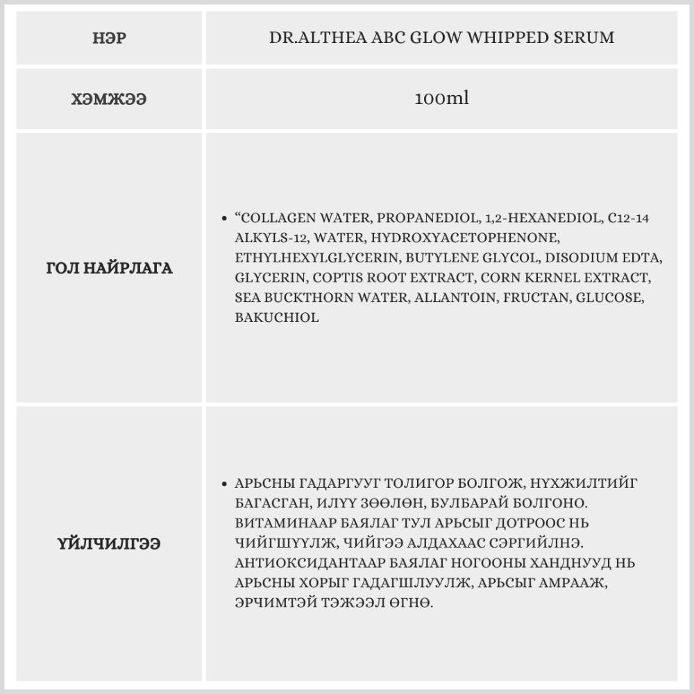 Энэ бүтээгдэхүүн нь арьсыг гүн чийгшүүлэн, арьсны гадаргууг толигор болгох, арьсанд тэжээл өгөх үйлчилгээтэй. Эмзэг, мэдрэмтгий арьсанд ч тохиромжтой, зуулан найрлагатай.