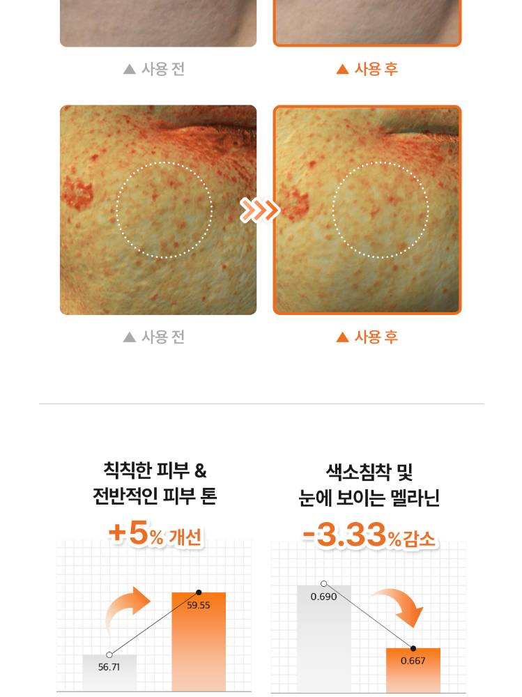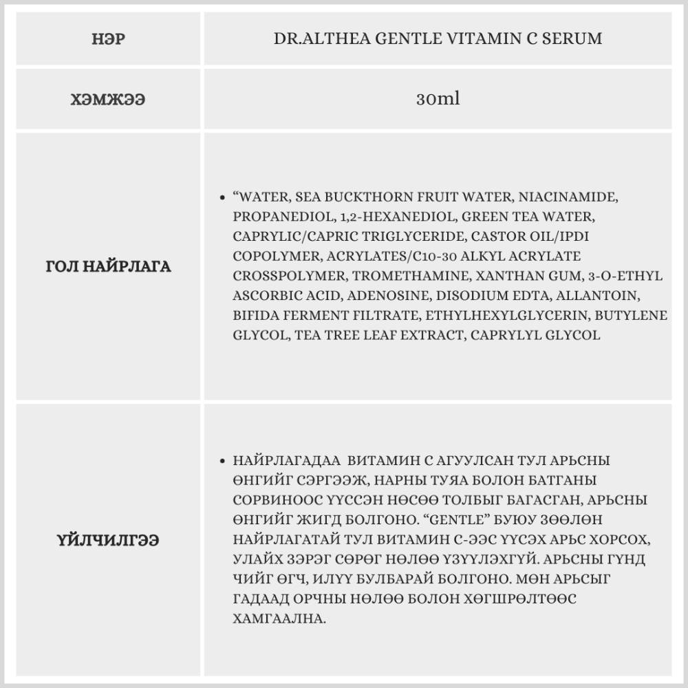 Энэхүү бүтээгдэхүүн нь арьсыг цайруулж, арьсны өнгийг жигд болгох үйлчилгээтэй. Мөн нөсөө толбо, батгашсан арьсыг тайвшруулна.