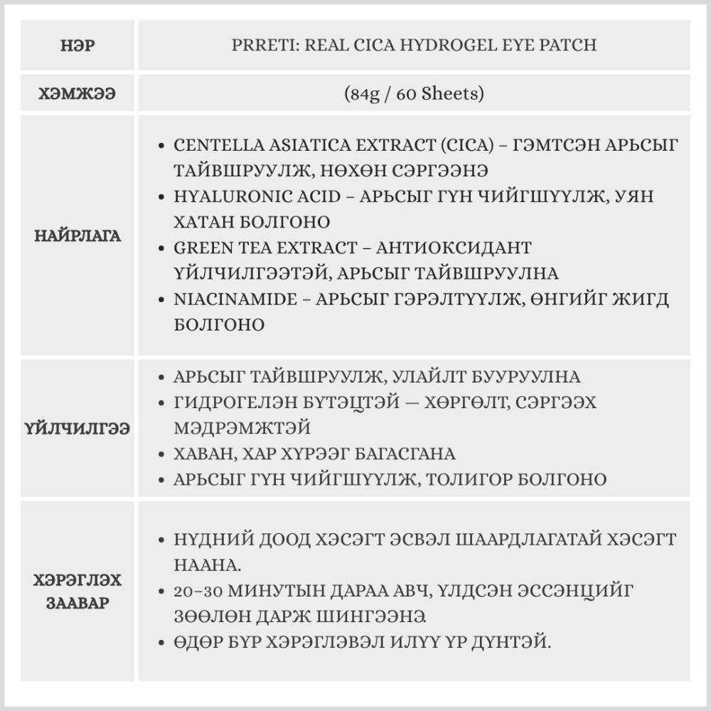 Центелла азиатика (CICA) болон гиалуроны хүчил агуулсан гидрогелэн нүдний маск бөгөөд арьсыг тайвшруулж, улайлт, хаван, хар хүрээг багасгана.Гидрогелэн бүтэц нь арьсанд нягт наалдаж, чийг болон тэжээлийг үр дүнтэйгээр дамжуулан арьсыг сэргээж, зөөлөн, толигор болгоно.