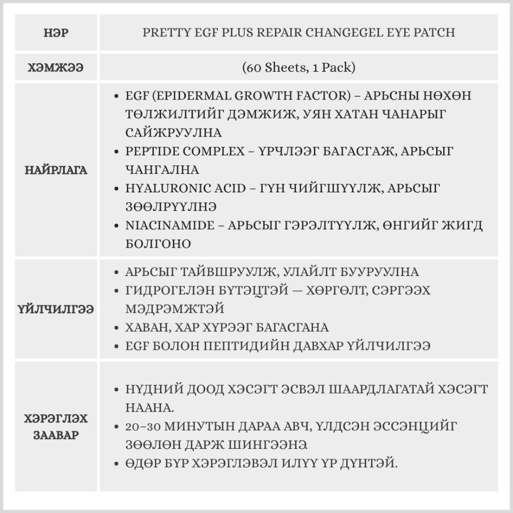 EGF (Epidermal Growth Factor) болон пептид агуулсан нүдний маск бөгөөд арьсыг нөхөн сэргээж, үрчлээ багасгаж, уян хатан чанарыг нэмэгдүүлнэ. Change gel бүтэц нь арьсанд наалдаж, гүн чийгшүүлж, тайвшруулах ба арьсыг гэрэлтсэн толигор болгоно.