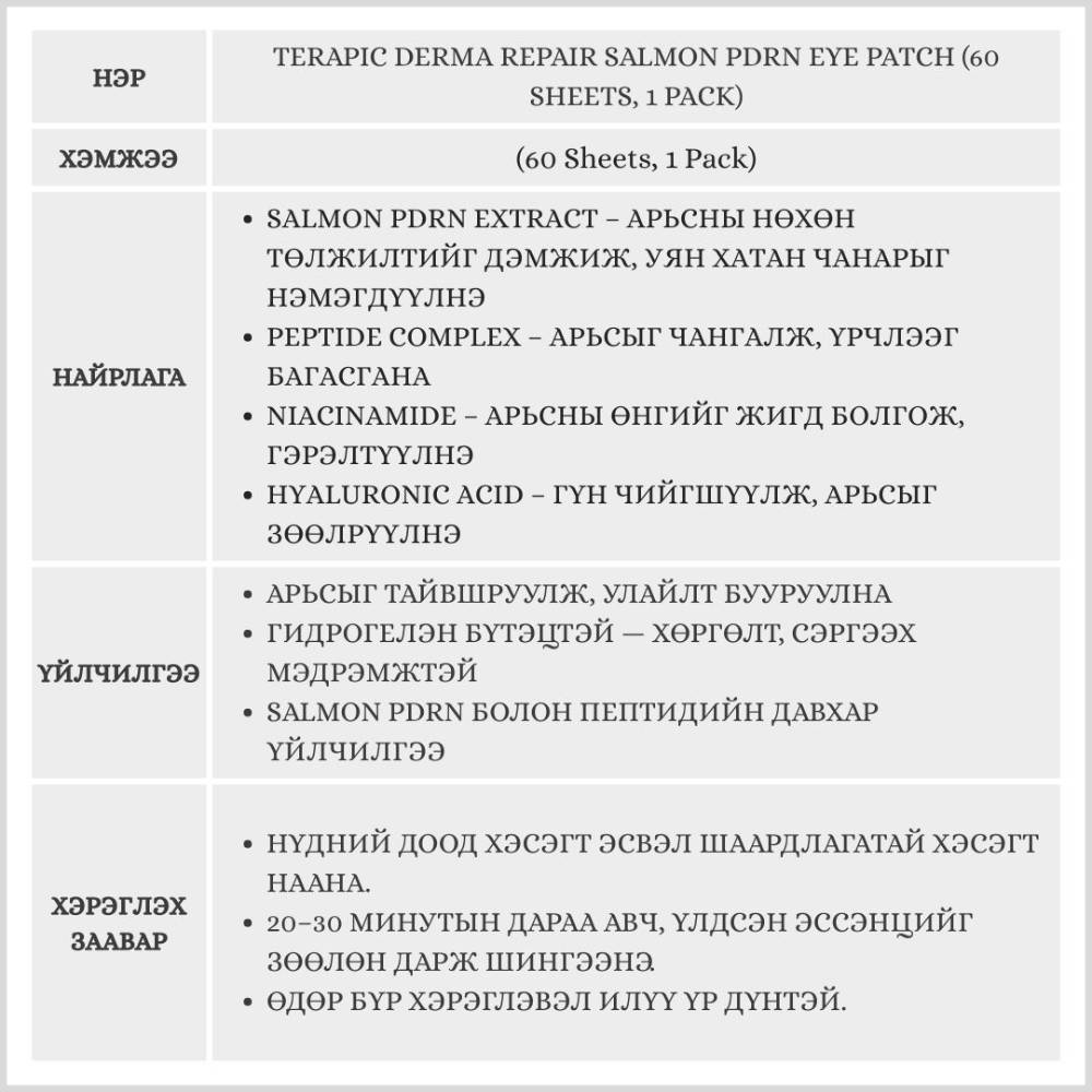 Salmon PDRN болон пептид агуулсан нүдний маск бөгөөд арьсыг нөхөн сэргээж, гүн чийгшүүлж, хар хүрээ, үрчлээ, нөсөө толбыг багасгана. Өндөр концентрацтай эссэнц нь арьсны эсэд нэвтэрч, арьсыг сэргээж, гэрэлтсэн, толигор болгоно.