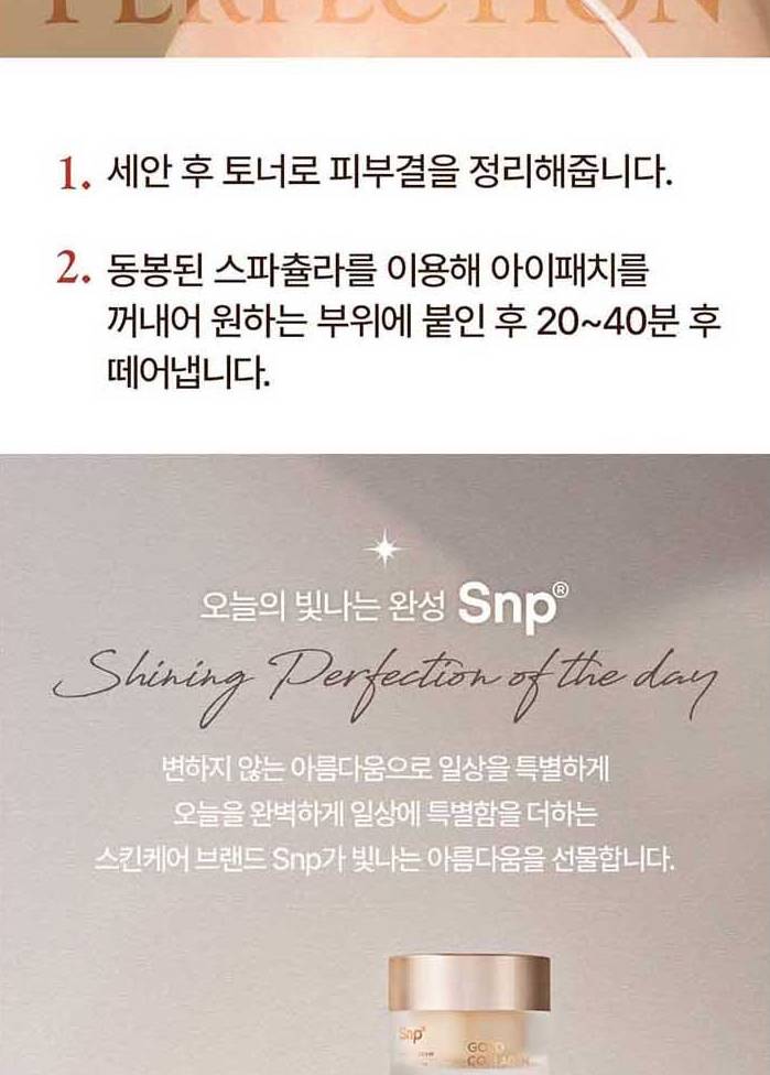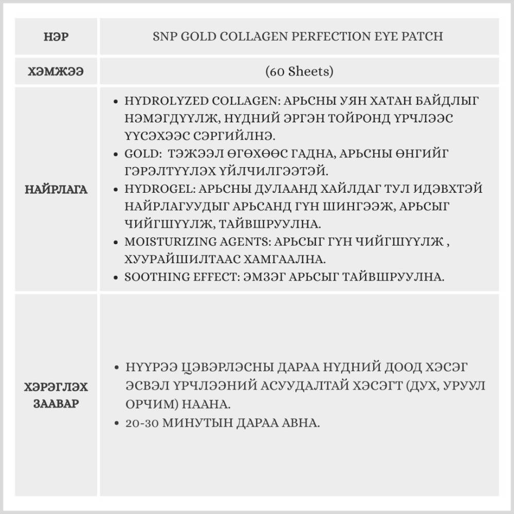Гидролизжүүлсэн коллаген болон алтны найрлагатай гидрогелэн маск бөгөөд, нүдний доорх арьсны уян хатан чанарыг нэмэгдүүлж, гүн чийгшүүлэх үйлчилгээтэй. Нүдний эргэн тойрны нарийн үрчлээс, хуурайшилтыг арилгаж, арьсыг гэрэлтсэн харагдуулна.
