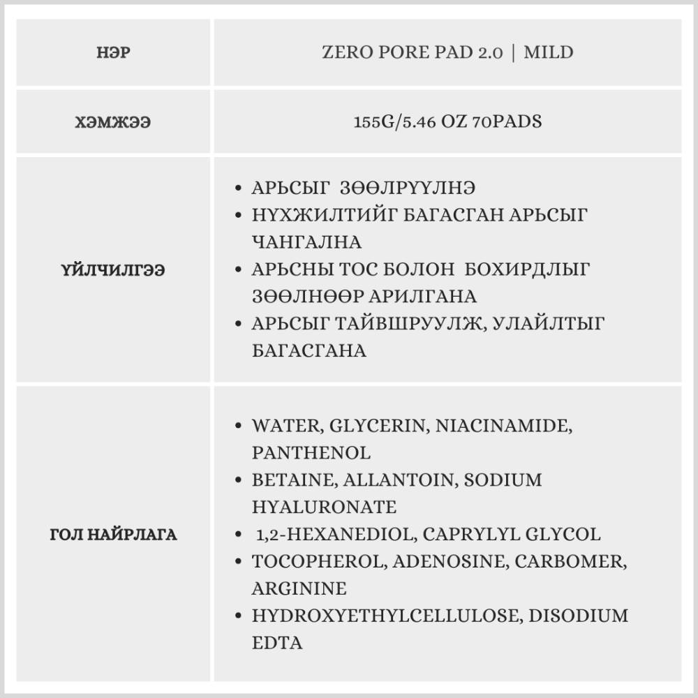 MEDICUBEАрьсыг цочроохгүй зөөлөн гуужуулж, нүхжилтийг багасган арьсыг чангаруулах үйлчилгээтэй бөгөөд бүх төрлийн арьсанд тохиромжтой. Чийгшүүлэх ба тайвшруулах найрлагатай тул эмзэг арьсанд ч өдөр бүр ашиглах боломжтой. Зөөлөн хоёр талт бүтэц нь бохирдлыг арилгахын зэрэгцээ арьсны гадаргууг жигд болгоно.