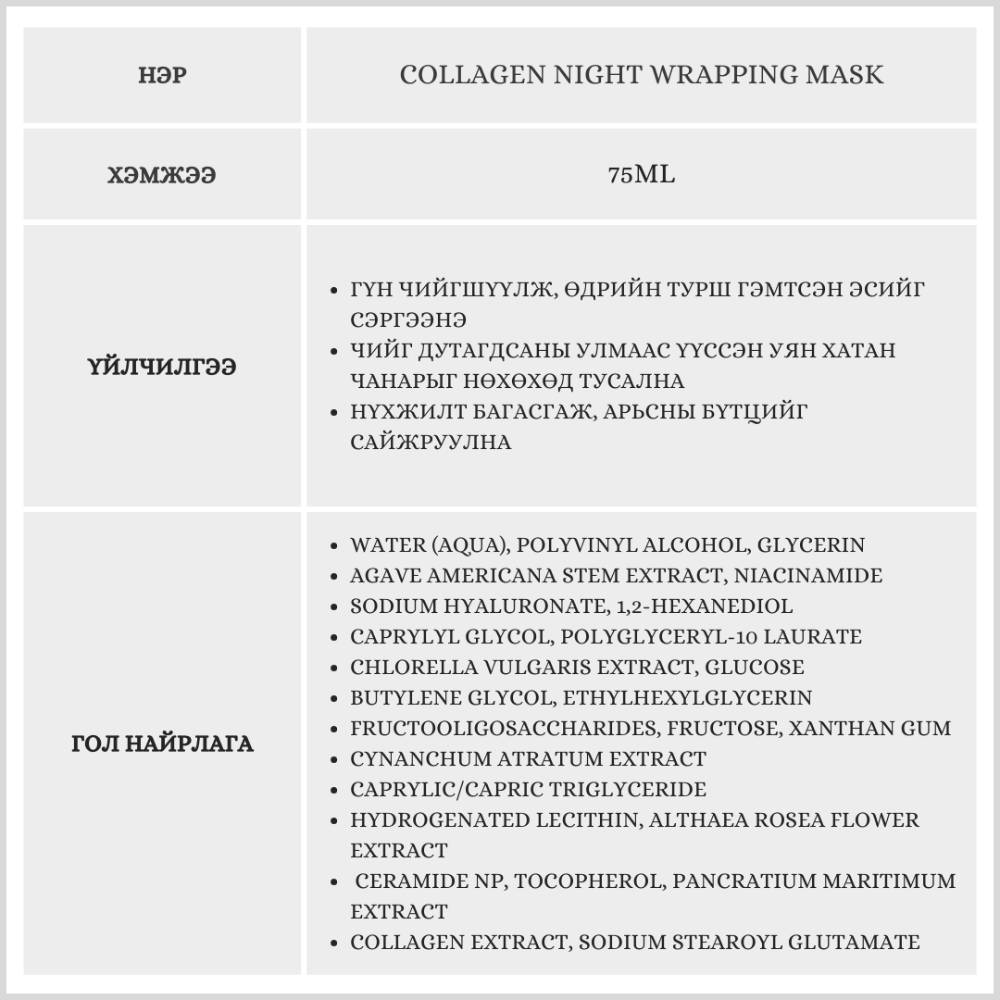 Коллаген агуулсан, арьсыг гүн чийгшүүлж арьсны уян хатан чанарыг нэмэгдүүлэх үйлчилгээтэй хуулдаг маск. Түрхэж унтах боломжтой ба шөнийн турш арьсанд тэжээл өгснөөр арьсыг гэрэлтсэн, толигор болгоно.