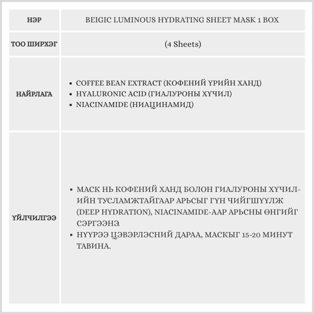 Beigic Luminous Hydrating Sheet Mask, 4p /Салфеткан маск/