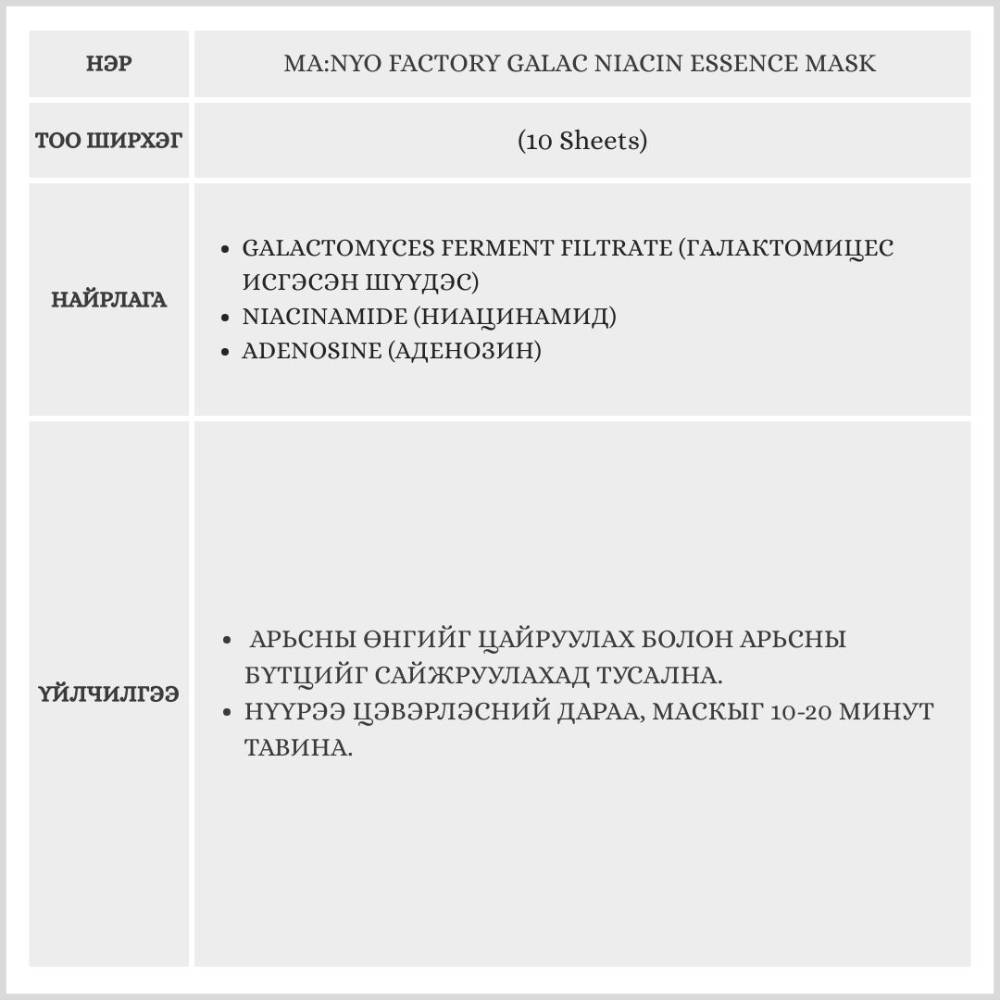 Galactomyces Ferment Filtrate болон Niacinamide-ын өндөр агууламжтай эссенцийг шингээсэн маск бөгөөд арьсны өнгийг сэргээн бүтцийг сайжруулах ба үрчлээний эсрэг үйлчилгээтэй гэдгээрээ онцлог бүтээгдэхүүн юм.