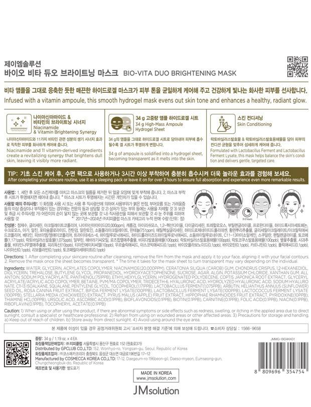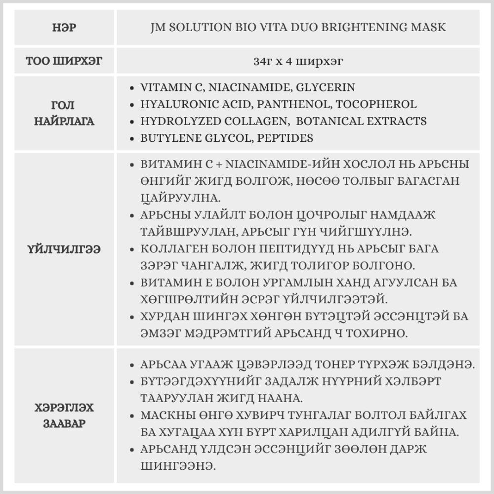 Витамин C + Niacinamide-ийн хослол бүхий арьсыг цайруулж, жигд өнгөтэй гэрэлтсэн толигор болгох үйлчилгээтэй маск. Давхар арьсыг тайвшруулж, гүн чийгшүүлэх ба эмзэг арьсанд ч хэрэглэхэд тохиромжтой.
