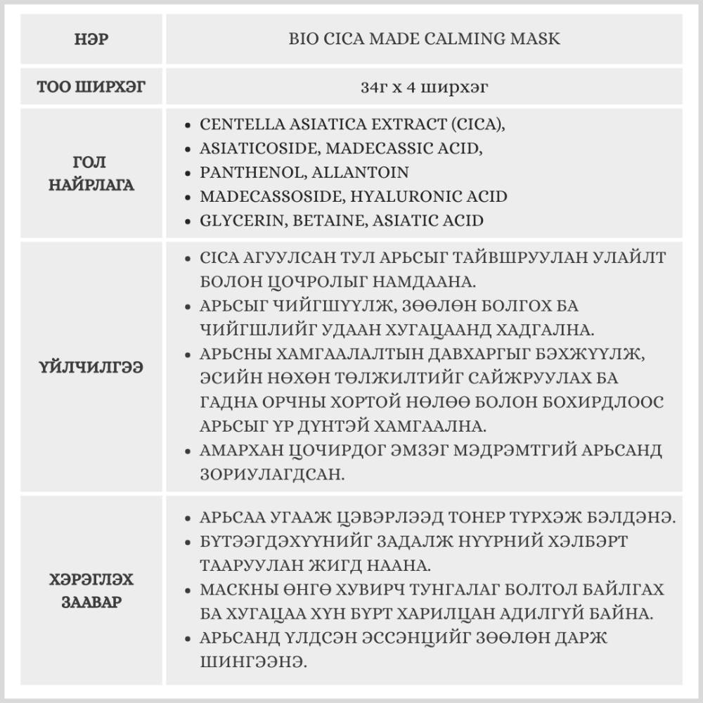 Эмзэг мэдрэмтгий, цочрол ихтэй арьсанд зориулагдсан Cica найрлагатай арьсыг тайвшруулж, чийгшүүлэх үйлчилгээтэй нүүрний салфеткан маск. Арьсны хамгаалалтын давхаргыг бэхжүүлж, орчны хортой нөлөө болон бохирдлоос үр дүнтэй хамгаална.