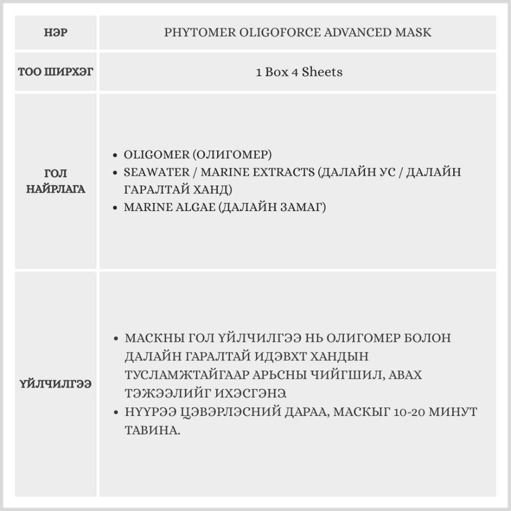 Seawater болон Oligomer-ийг суурь найрлага болгон агуулсан энэхүү 4 ширхэгтэй маск нь арьсыг гүн чийгшүүлж, тэжээлээр хангана. Мөн арьсны хамгаалах давхаргын чадварыг дэмжин арьсыг илүү толигор зөөлөн харагдуулна.