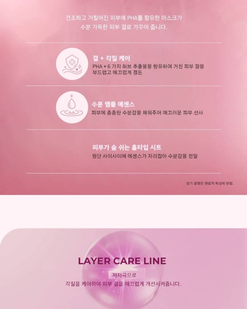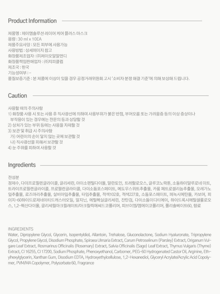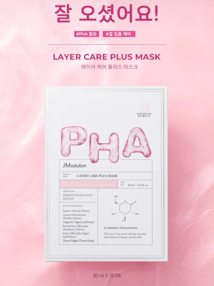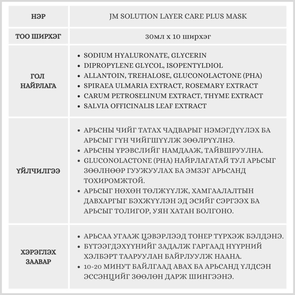 JMsolution Layer Care Plus Mask нь олон төрлийн чийгшүүлэгч найрлага болон ургамлын хандыг агуулсан тул арьсыг гүн чийгшүүлж, тайвшруулан хамгаалах давхаргыг бэхжүүлдэг төдийгүй PHA (Gluconolactone)-ийн зөөлөн гуужуулах үйлчилгээгээр арьсны бүтцийг толигор жигд болгодог маск юм.