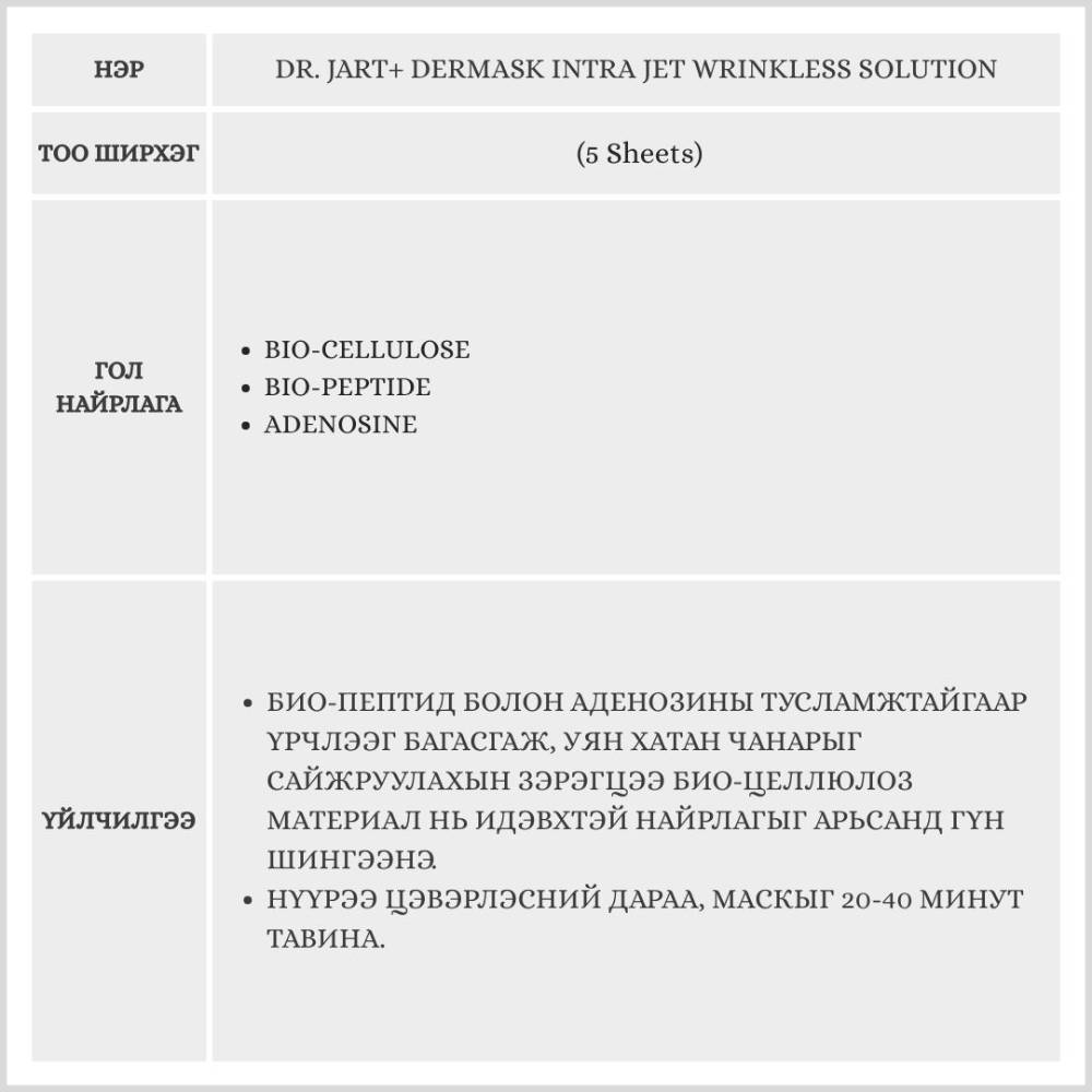 Био-целлюлоз материалаар тусгайлан хийгдсэн маск бөгөөд арьсны үрчлээг багасгаж уян хатан чанарыг нэмэгдүүлэх үйлчилгээтэй. Арьсанд гүн чийгшил өгч, уян хатан байдлыг нэмэгдүүлснээр арьсыг илүү толигор зөөлөн харагдуулна.